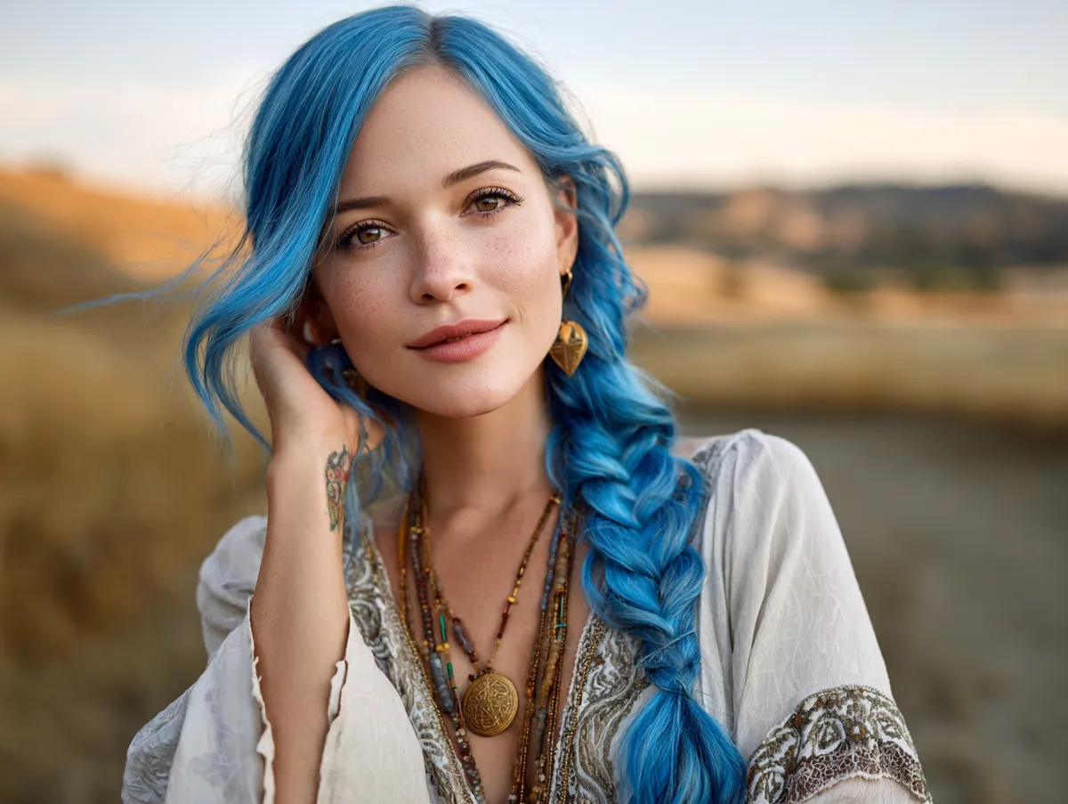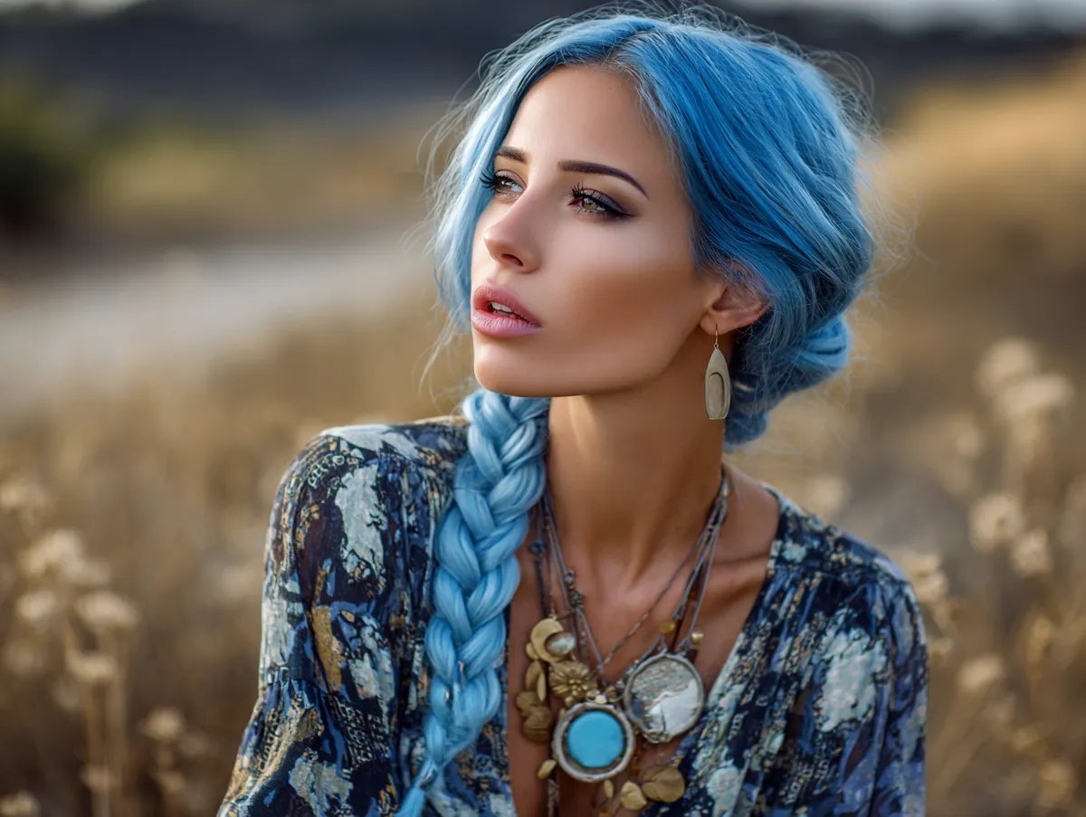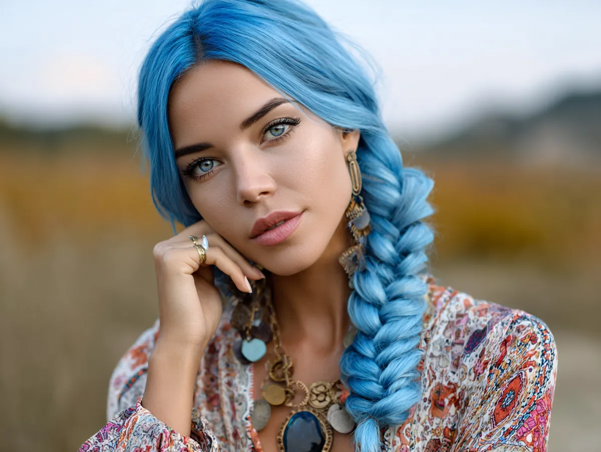 This look is especially suited for casual outings, nature walks, or creative events where a relaxed yet styled appearance is desired. The loose structure of the braid keeps it comfortable, while the vibrant blue shade ensures it makes a bold impression. Greasy hairstyles centered on braiding allow wearers to celebrate length while keeping hair out of the way.