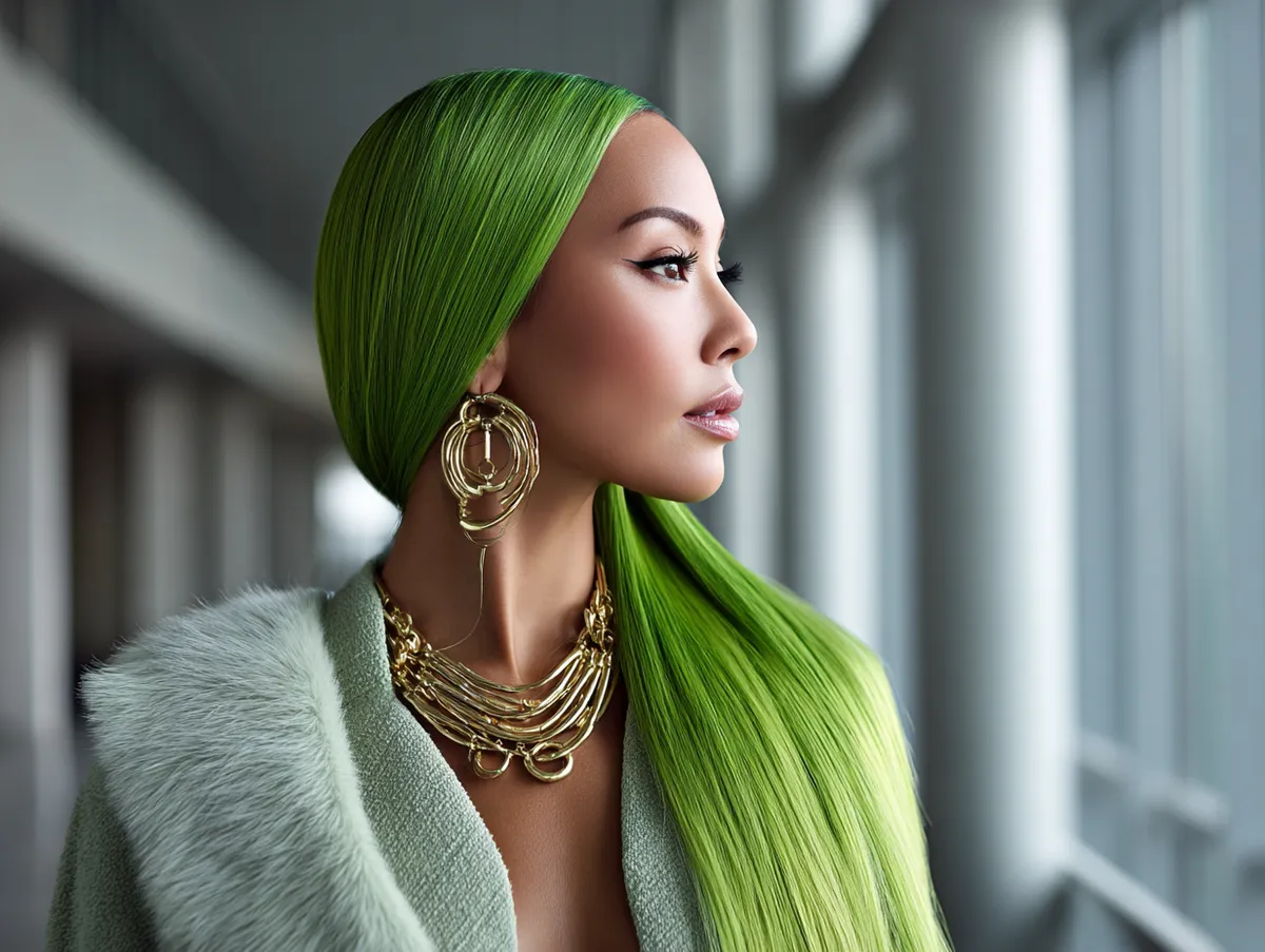 There is nothing more striking than long hair worn down in a straight, glossy finish, especially when it glows in a bright green shade. Greasy hairstyles work perfectly for this because natural oils help the strands lie flat, creating a mirror-like sheen that feels deliberate and eye-catching. Rather than hiding oily roots, this style puts them to work in a way that celebrates boldness.