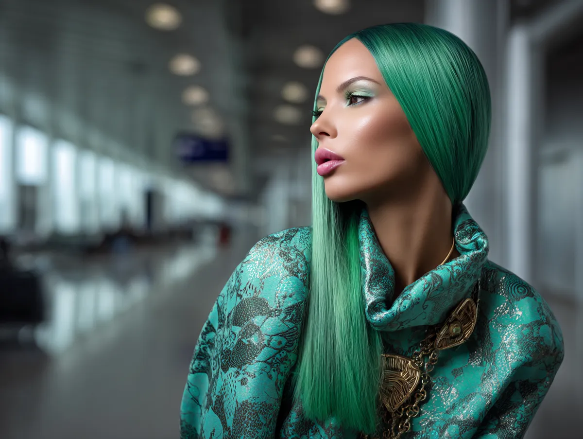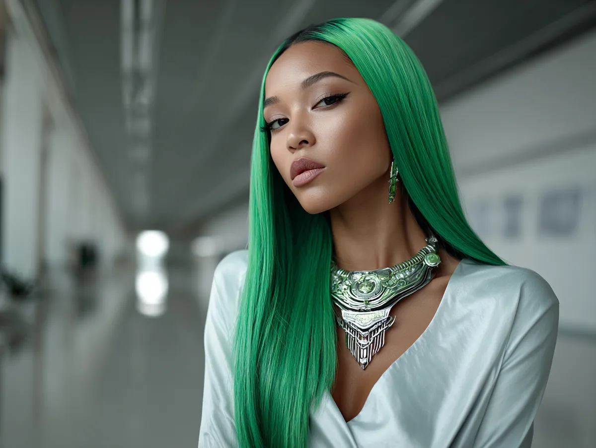 To achieve the look, part the hair neatly in the center and run a comb through until the strands lie evenly on both sides. Long hair in green shines vividly, and the oils provide a sleek, almost liquid-like quality. Greasy hairstyles styled in this way eliminate frizz and enhance color saturation, making the green hue appear more intense.