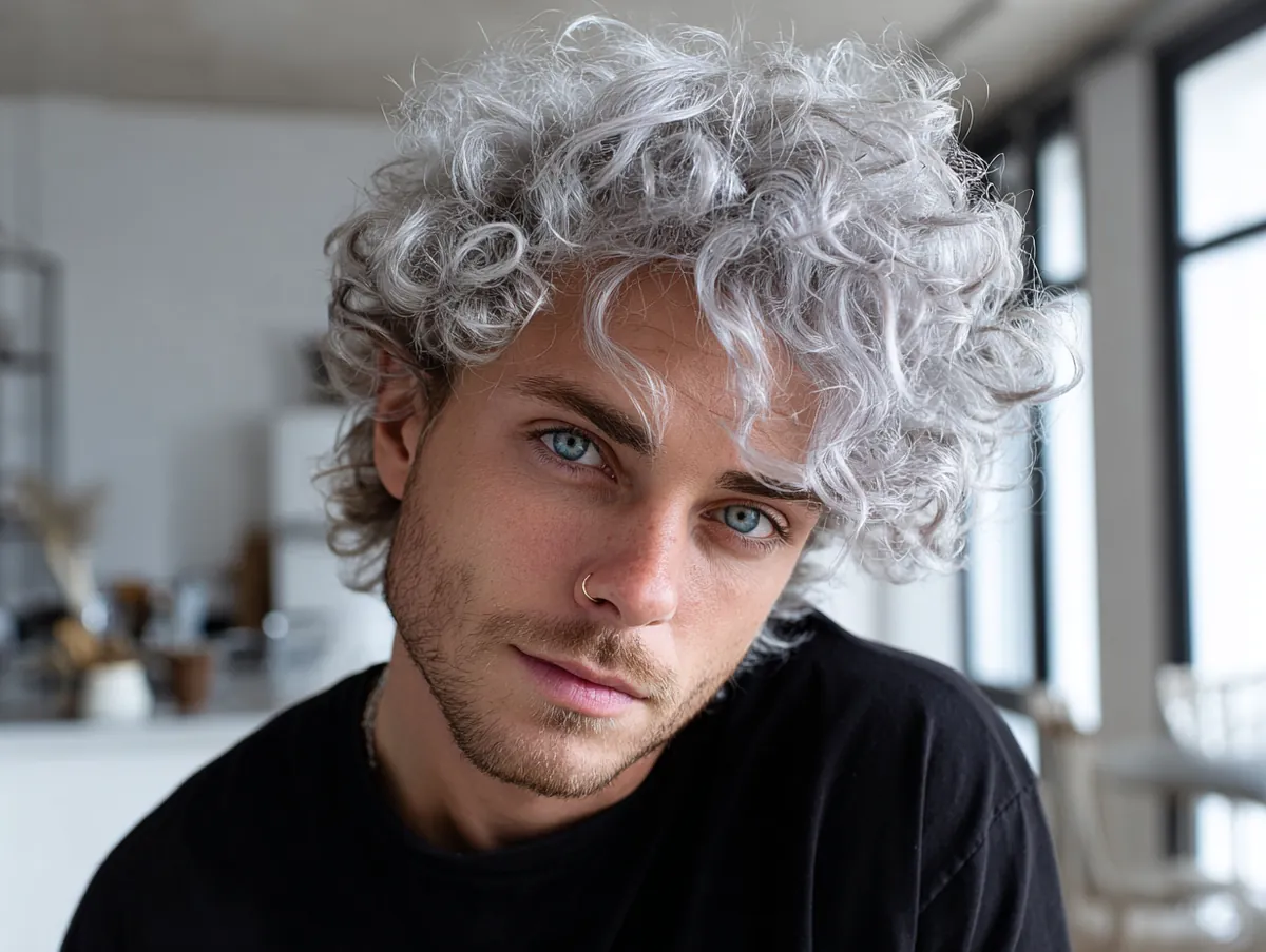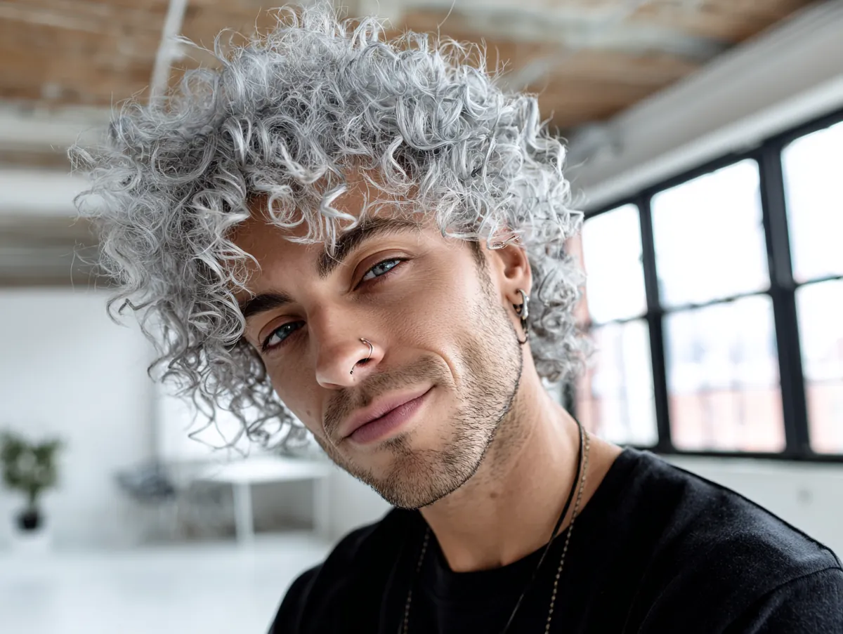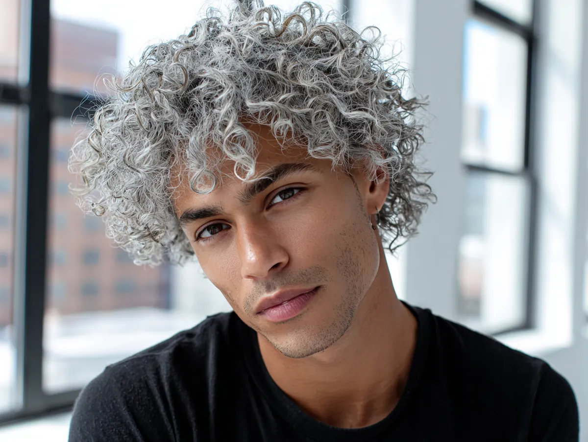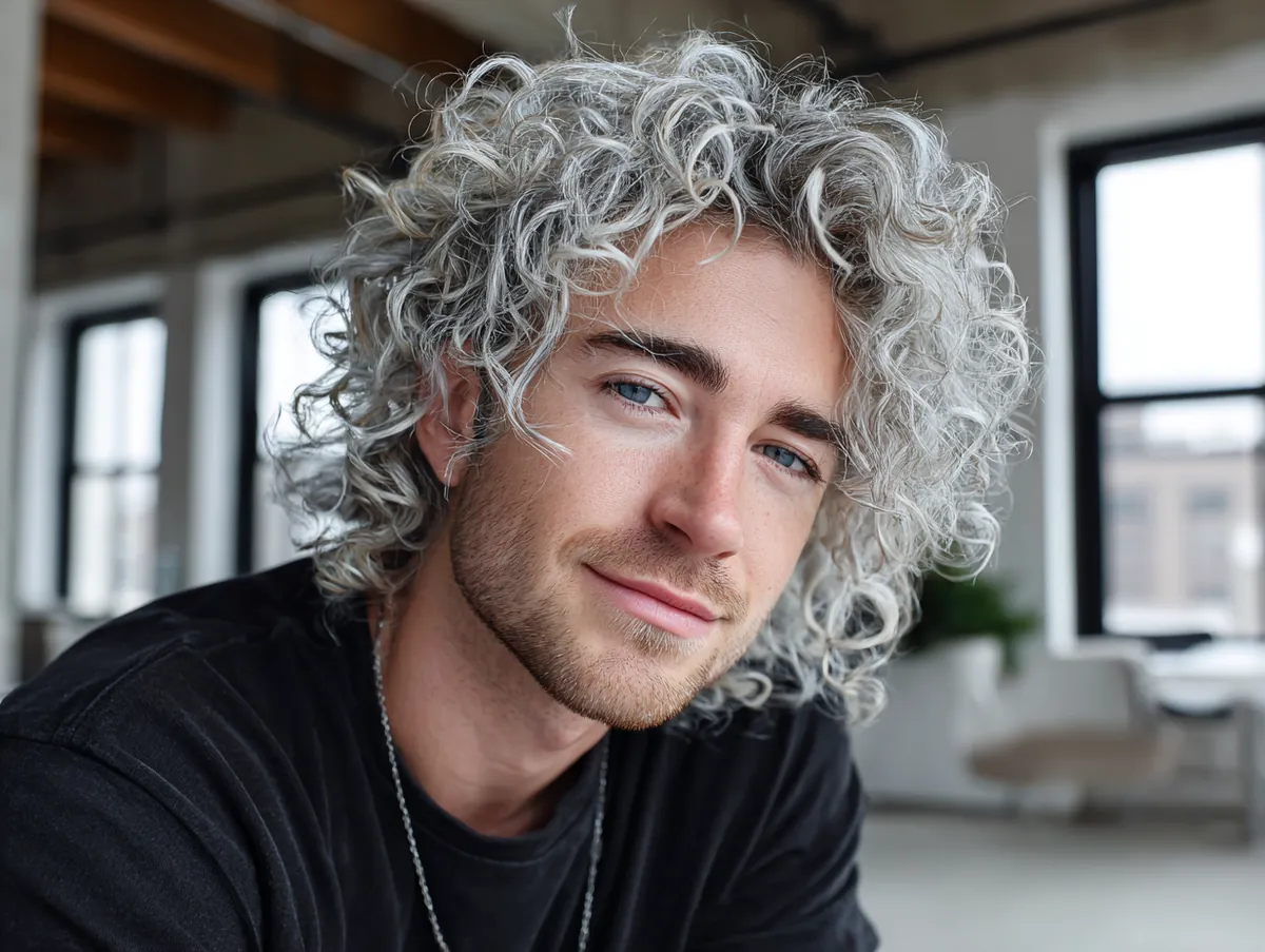 In a modern loft setting, the natural light bouncing off the soft silver curls adds dimension to the hairstyle. The brightness highlights the texture of the curls, making them appear fuller and more voluminous. The silver tone is subtle yet eye-catching, providing a fresh alternative to more traditional hair colors. With a casual black t-shirt, the hairstyle takes center stage, allowing the silver curls to shine in their own right.