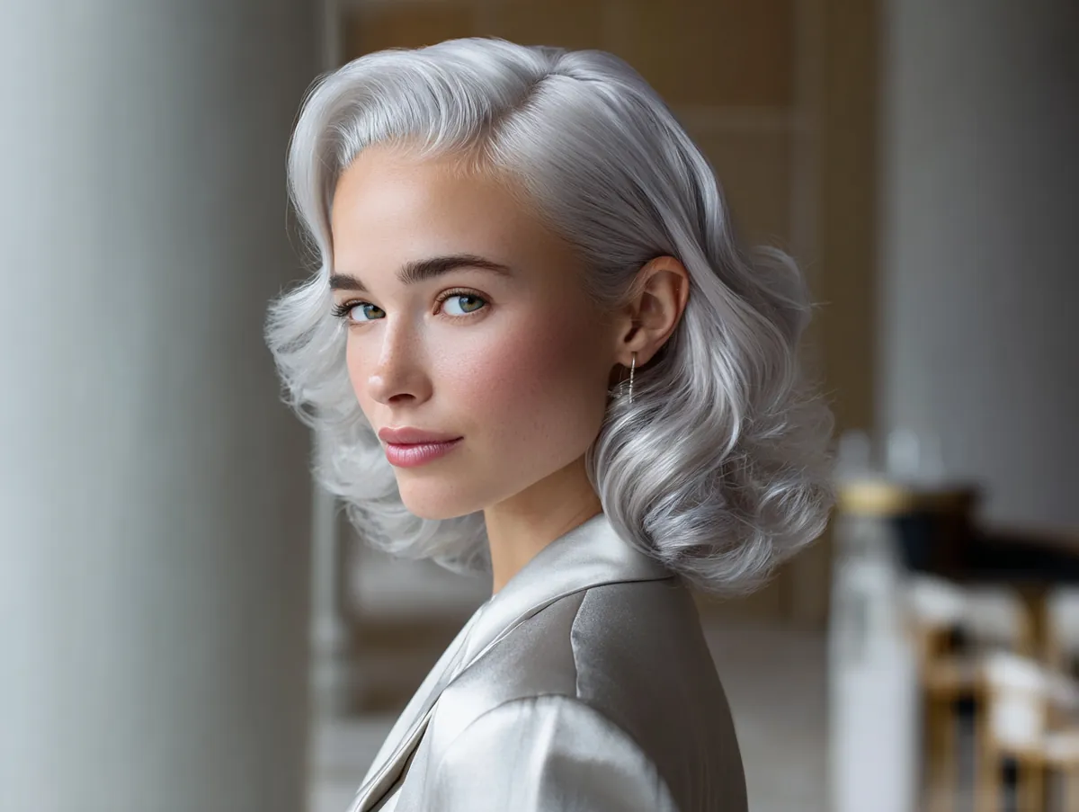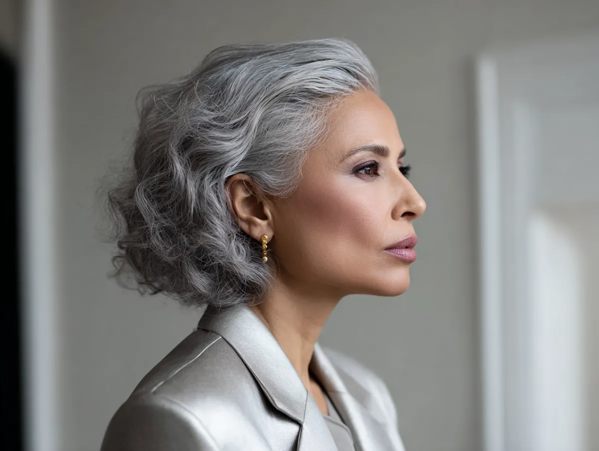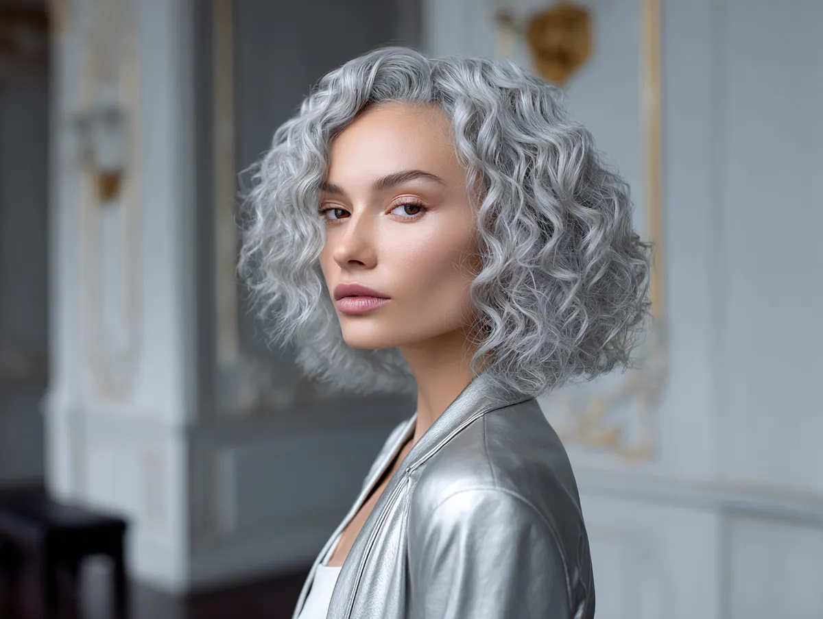 This hairstyle works particularly well in a softly lit, elegant setting, where the light reflects off the subtle silver curls, highlighting their texture and depth. The silver color is not too bold, yet it creates a striking contrast against the soft curls, making the overall look feel both chic and sophisticated. Paired with a simple silver jacket, this style is elevated even further, creating a harmonious balance between the hair and the outfit.