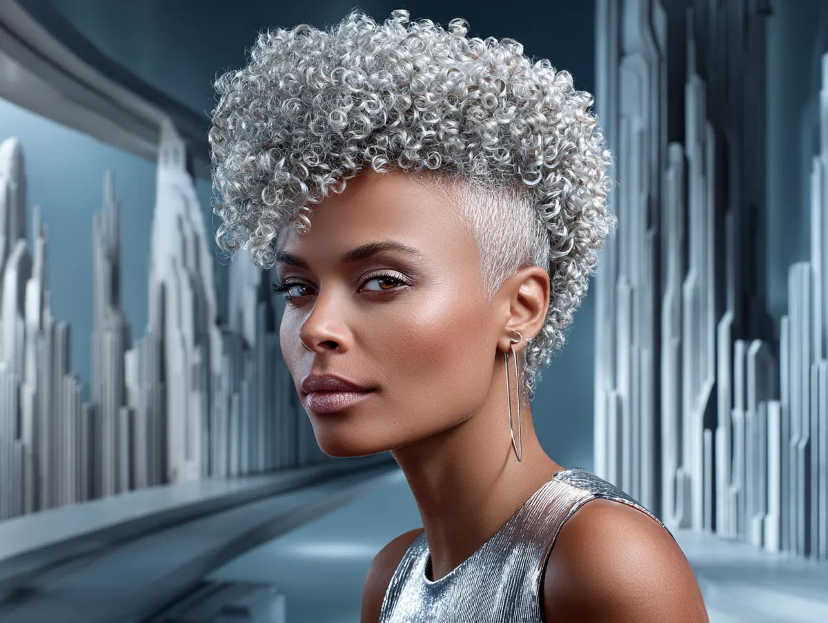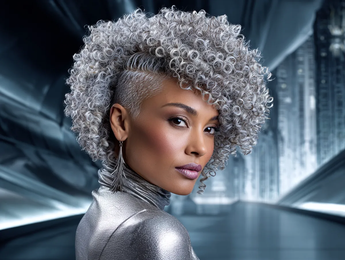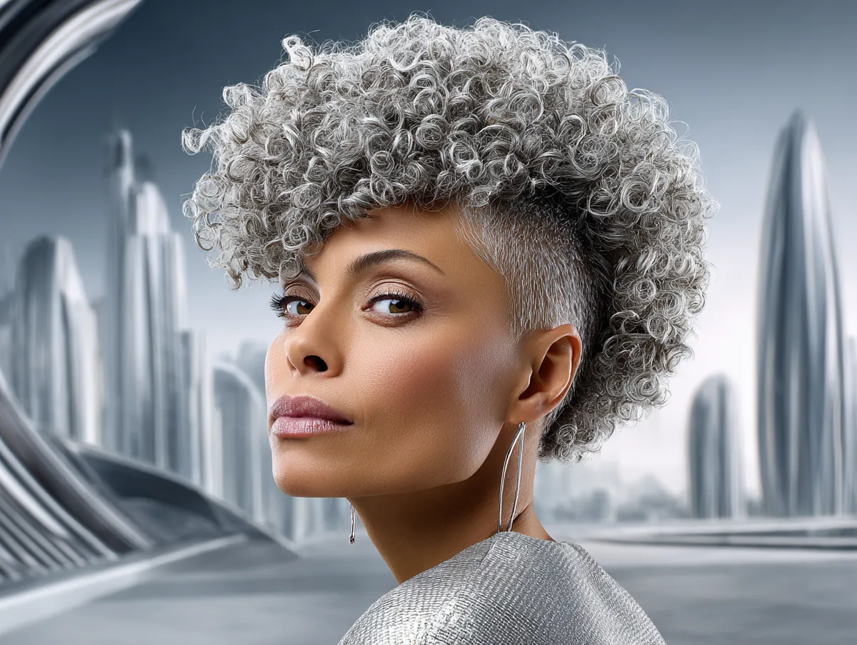 Set against a futuristic cityscape, this bold look stands out as both avant-garde and wearable. The metallic tones of the background emphasize the silver color of the curls, making them appear even more striking. The angular cut of the mullet, combined with the tight texture of the curls, gives this style a sense of movement and precision. Wearing a silver metallic top, the woman in this look creates a cohesive, forward-thinking appearance that feels as if it belongs in a high-fashion editorial.