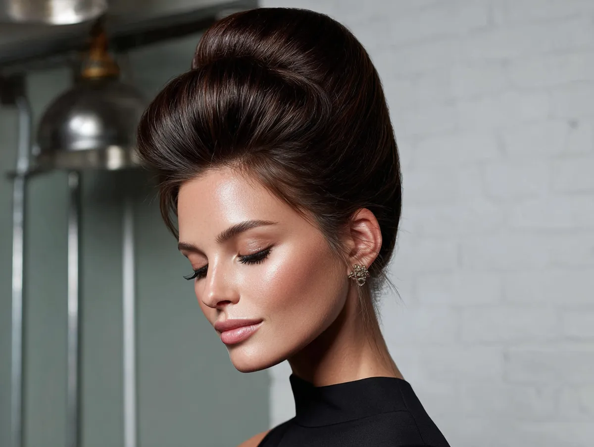 Espresso brown shades bring depth and richness to a voluminous style, allowing the shape to stand out while maintaining a natural elegance. Medium hair is ideal for creating a balanced bouffant, as it provides enough length for structure without overwhelming the overall silhouette. To build the style, the crown is teased gently, and the strands are smoothed into position with a sleek finish. The dark tones of espresso brown enhance the contrast within the bouffant, highlighting every curve of the hairstyle.