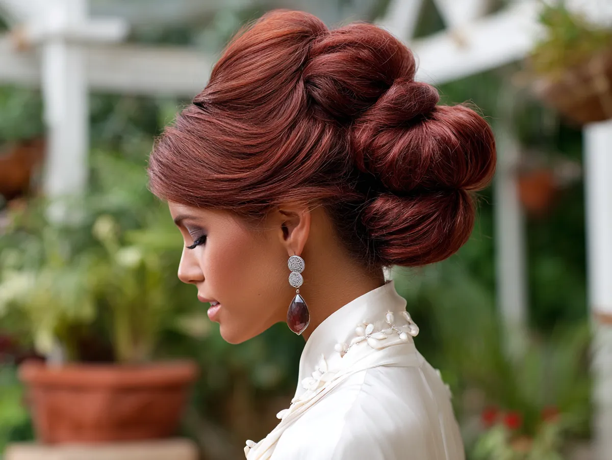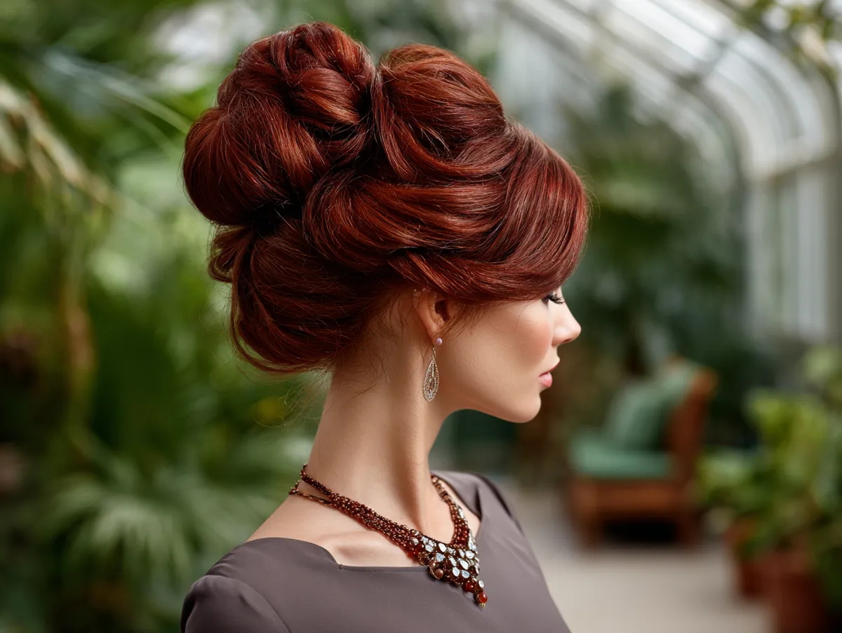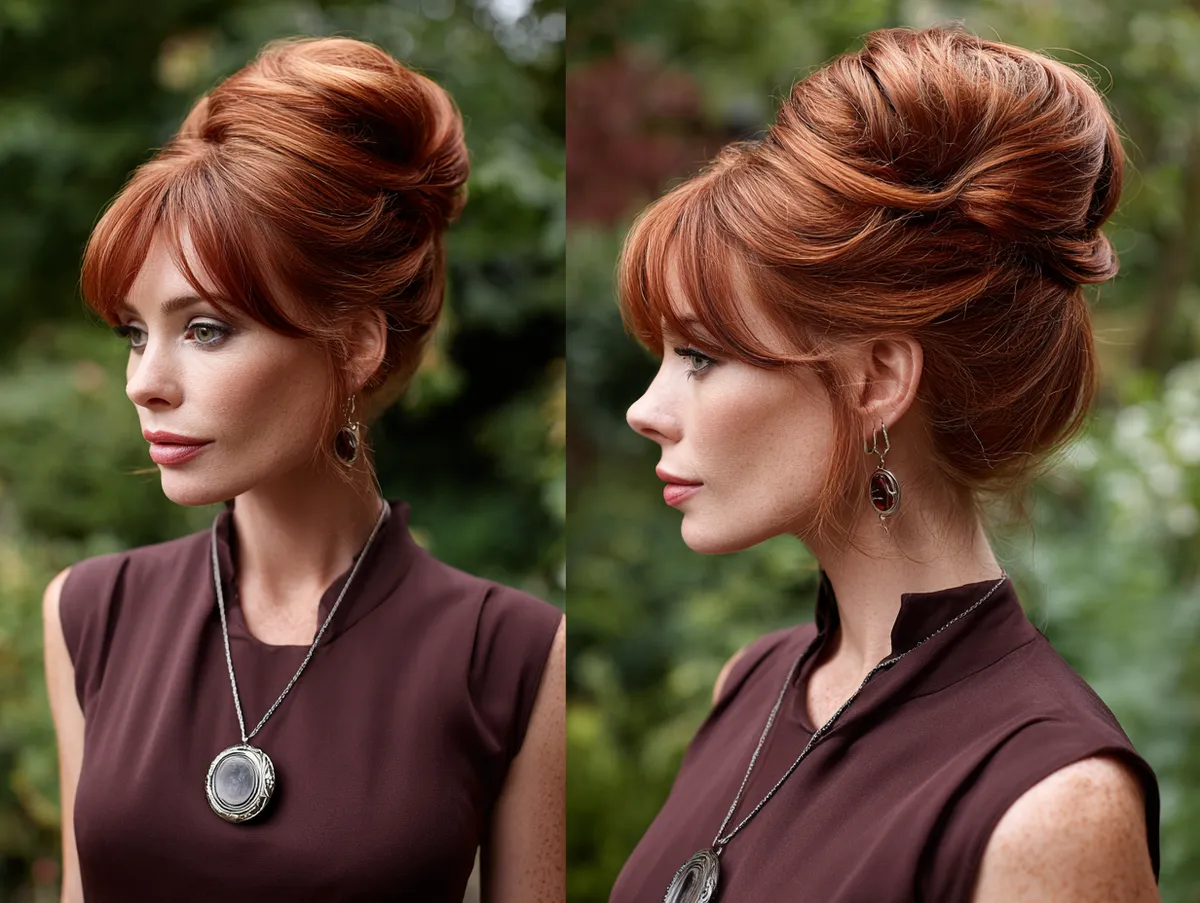 In terms of upkeep, a light texturizing spray provides support and helps maintain volume throughout the day. Because mahogany red shades reflect light beautifully, avoiding heavy products is essential to keep the color vibrant. Bouffant updos for medium hair in this hue show how color can transform a familiar hairstyle into something memorable, blending classic form with modern vibrancy.