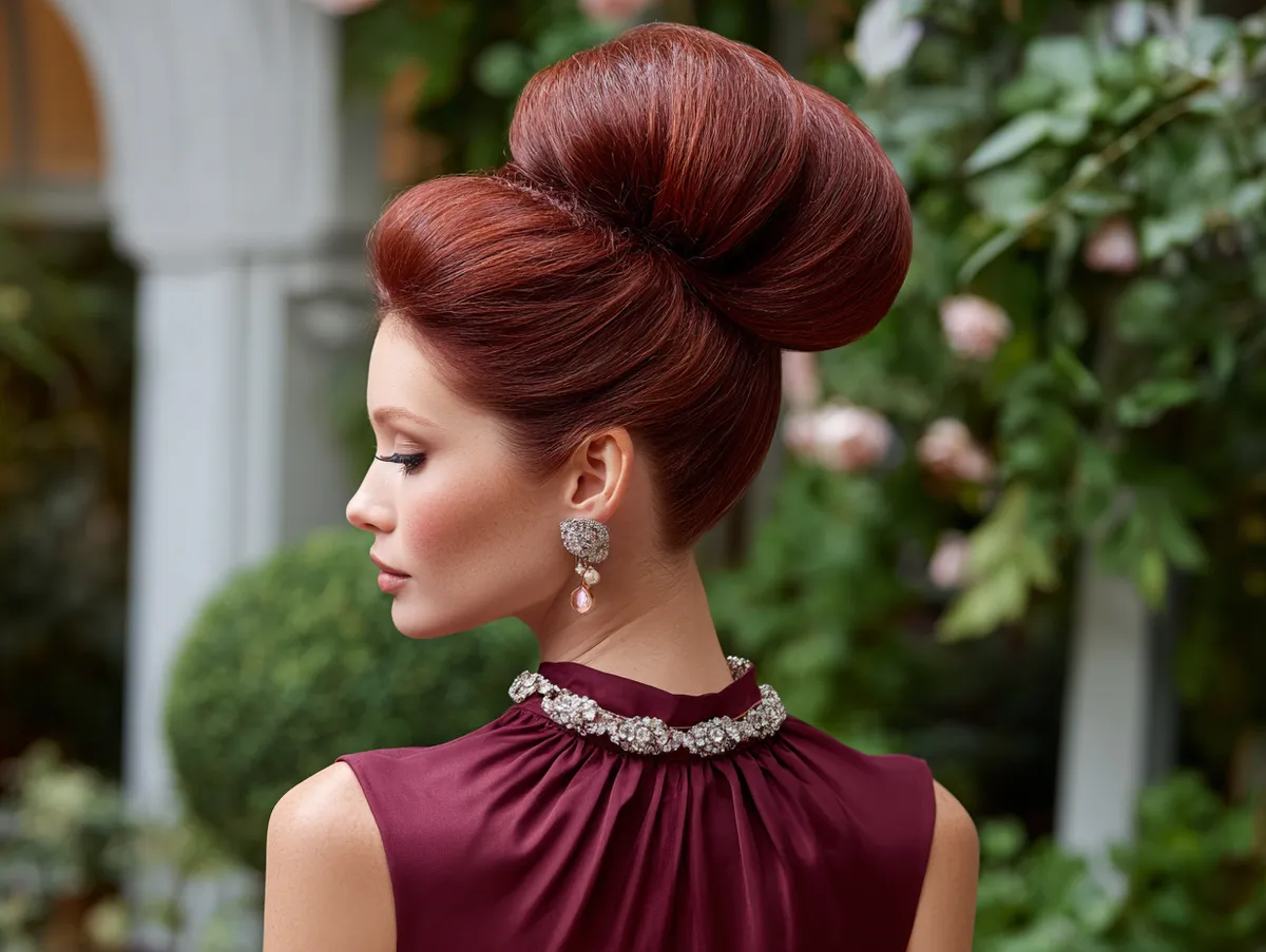 Mahogany red adds warmth and vibrancy to a voluminous hairstyle, making the bouffant appear dynamic and full of life. Medium hair works perfectly with this shade, as the length provides the right amount of body for a structured style while still allowing movement. The hairstyle begins with gentle teasing at the crown, building the iconic height of the bouffant. The strands are then smoothed and shaped into the finished form, with the reddish tones enhancing the overall texture.