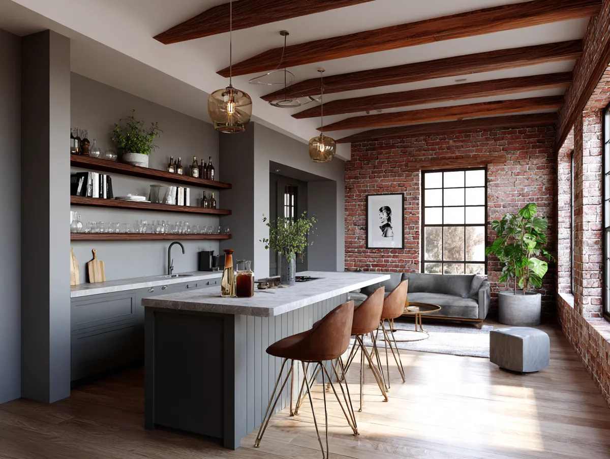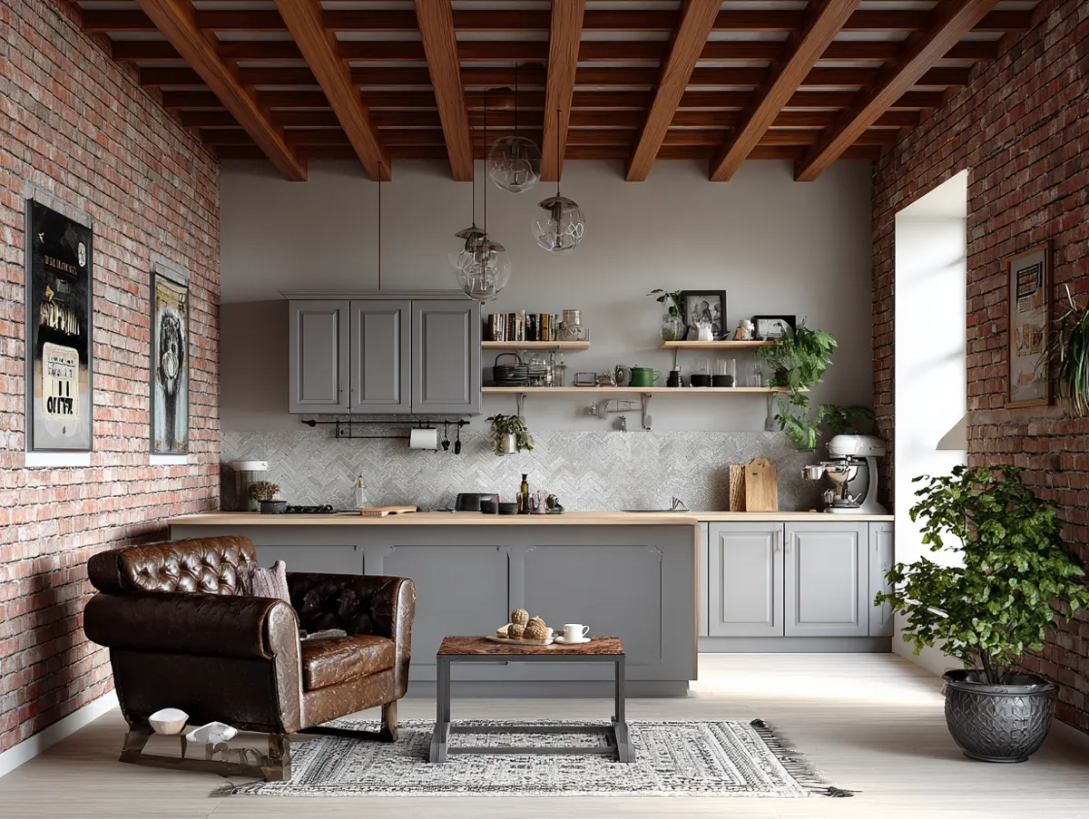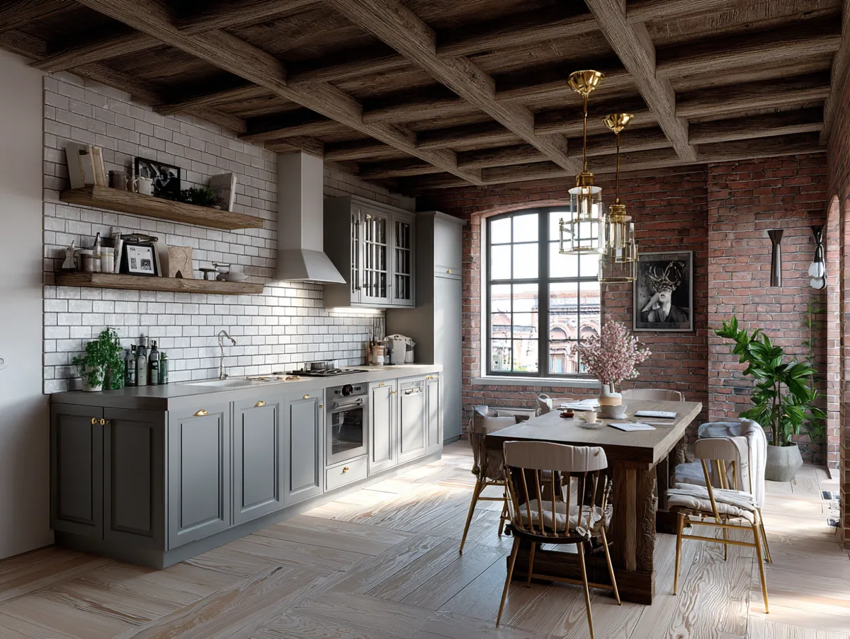 The grey hue, often associated with urbanity and modernity, finds a perfect partner in rustic elements that speak of history, warmth, and character. Imagine sleek grey cabinets paired with a reclaimed wooden island or a modern grey backsplash set against a wall of exposed bricks. These combinations bring out the best of both worlds, creating a kitchen that is both functional and full of character.