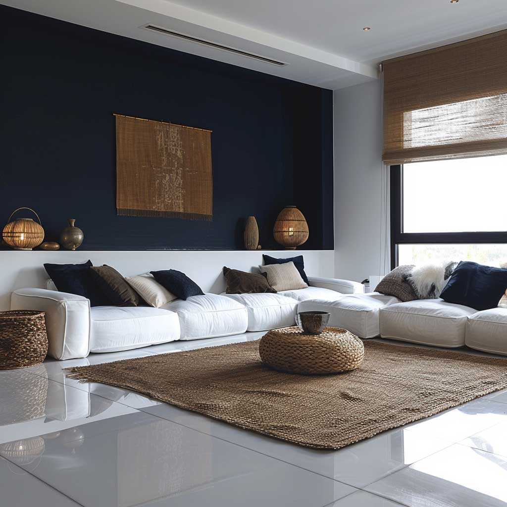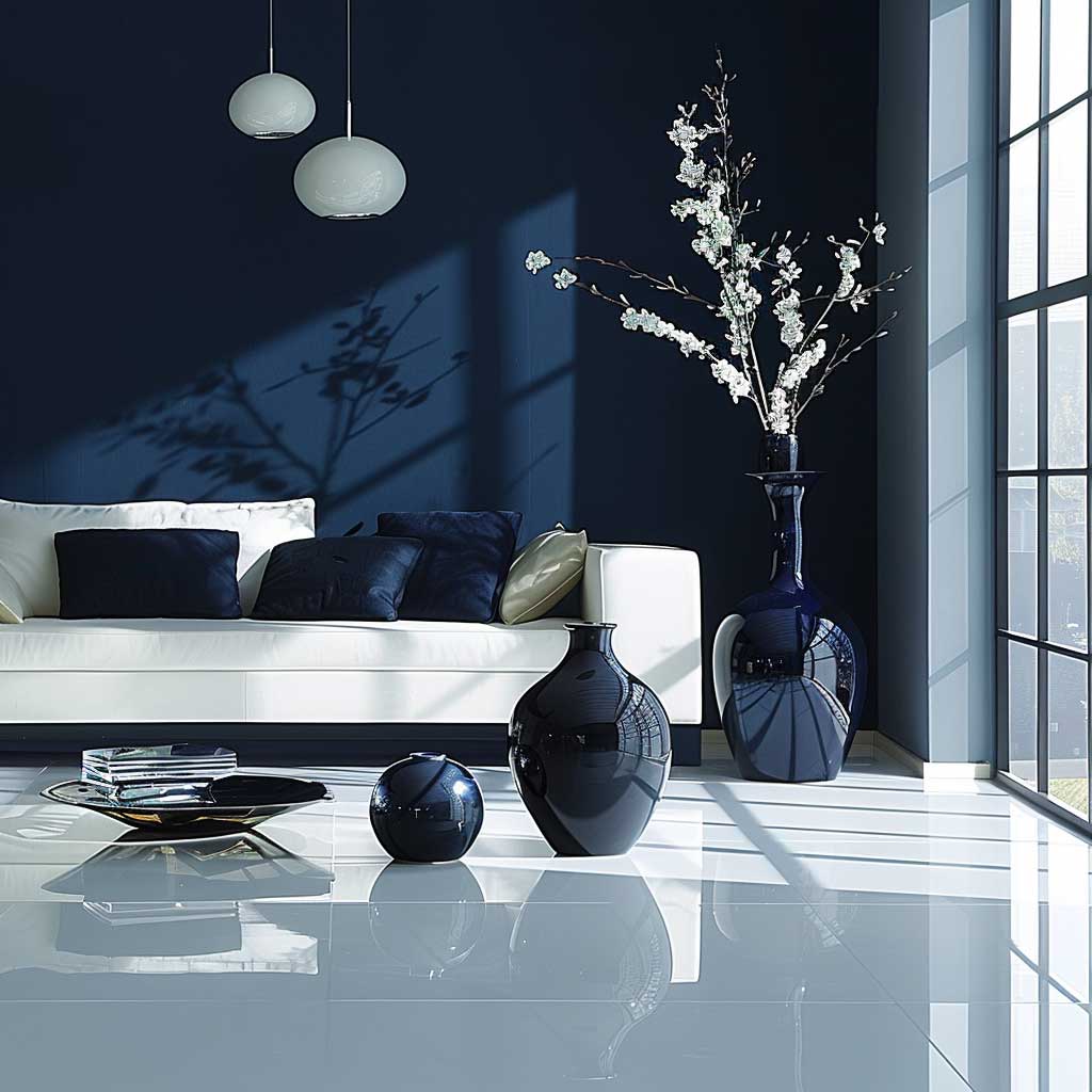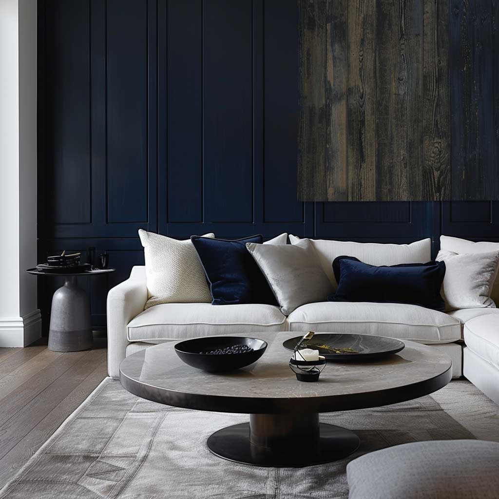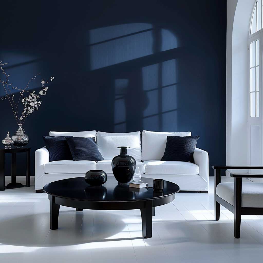 Lighting plays a crucial role in enhancing the elegant minimalism of the living room. Strategic placement of lamps and fixtures can create a warm and welcoming atmosphere, accentuating the rich navy blue and contrasting beautifully with the crisp white walls.