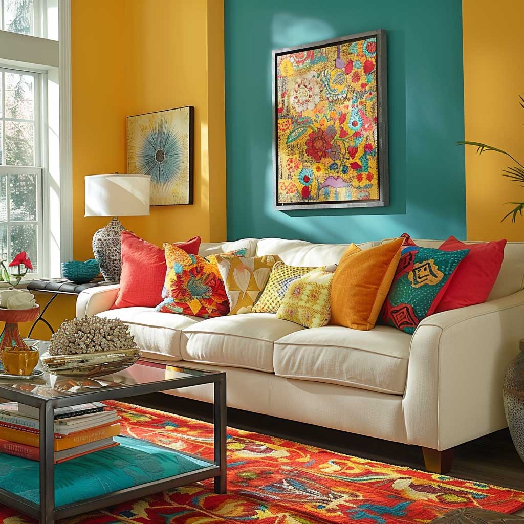 In crafting a living room that exudes vibrant energy, the key lies in embracing boldness while maintaining balance. The lively turquoise and sunny yellow, when paired thoughtfully, create a space that is both energizing and comforting. This approach to design celebrates the joyful side of life, encouraging residents and guests alike to feel uplifted and inspired.