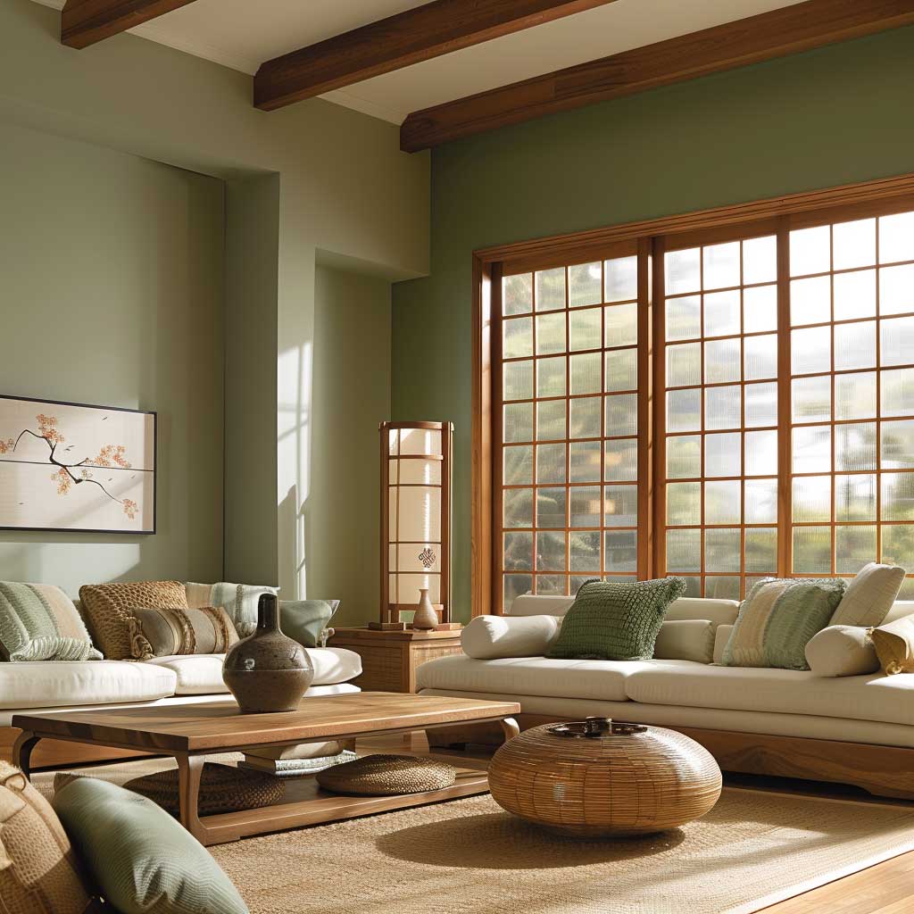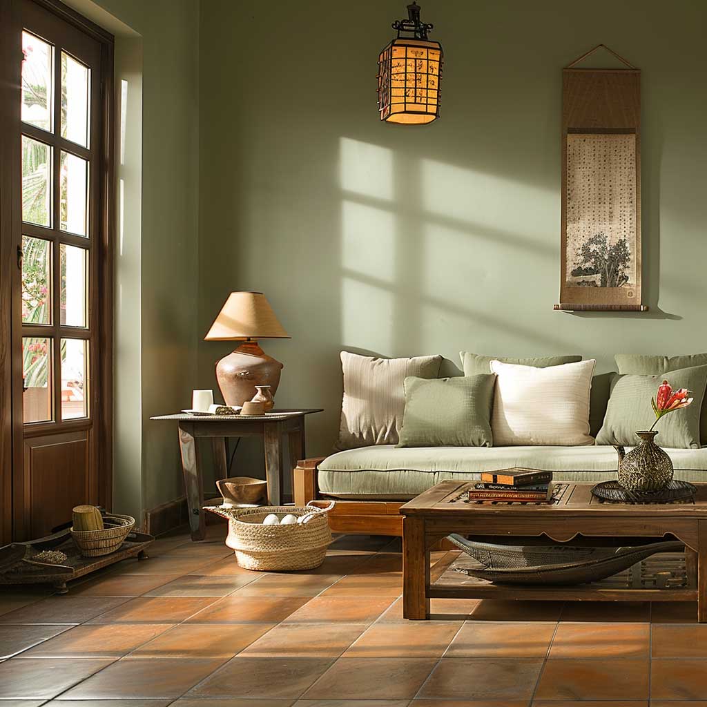The interplay of these colors and textures in the living room creates an ambiance that is both tranquil and earthy. The soft, muted green walls provide a calming backdrop, while the warm beige and rich terracotta accents add depth and warmth. Natural wood furniture and minimalist decor complete the serene setting, making the living room a perfect space for relaxation and rejuvenation.