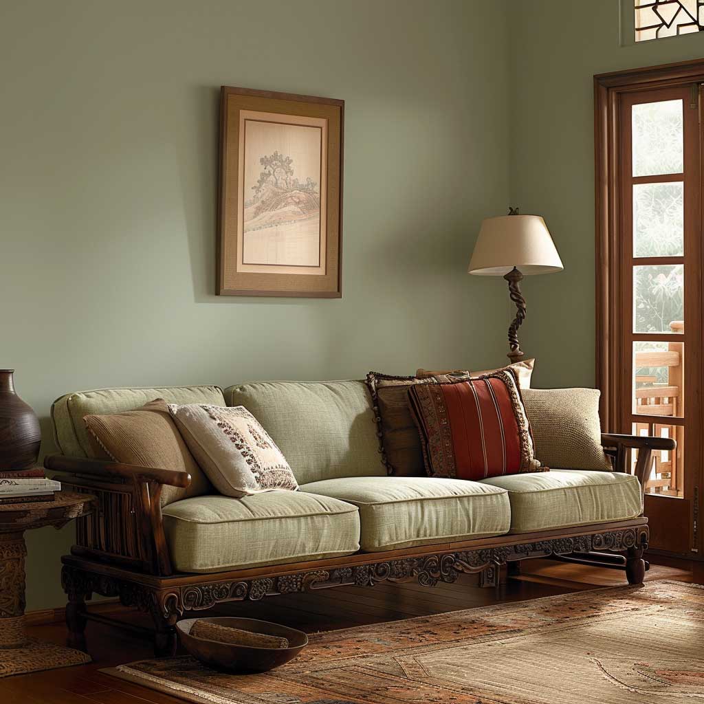 The foundation of this serene harmony lies in the selection of a soft, muted green for the living room walls. This color, reminiscent of the early morning mist in a lush forest, brings a sense of renewal and growth into the space. Green, in its muted form, acts as a backdrop that promotes relaxation and contemplation, making it an ideal choice for a room dedicated to unwinding and gathering.