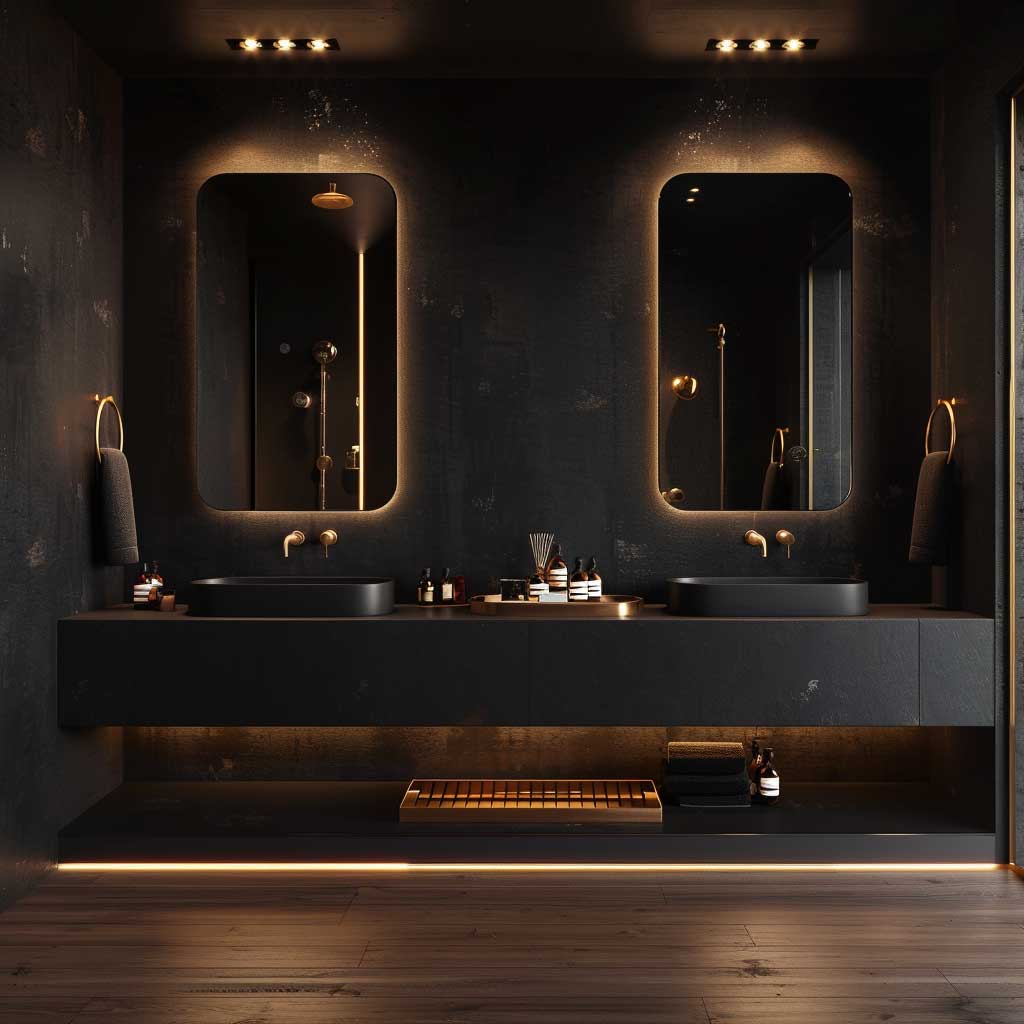 The choice of fixtures in this color palette is crucial. Gold faucets, showerheads, and even towel bars can transform everyday functionality into an aesthetic pleasure. These elements should echo the modern theme with their design—think sharp lines and minimalist style. The contrast between the reflective gold and the absorbent black surfaces creates a dynamic visual interest that is both captivating and elegant.