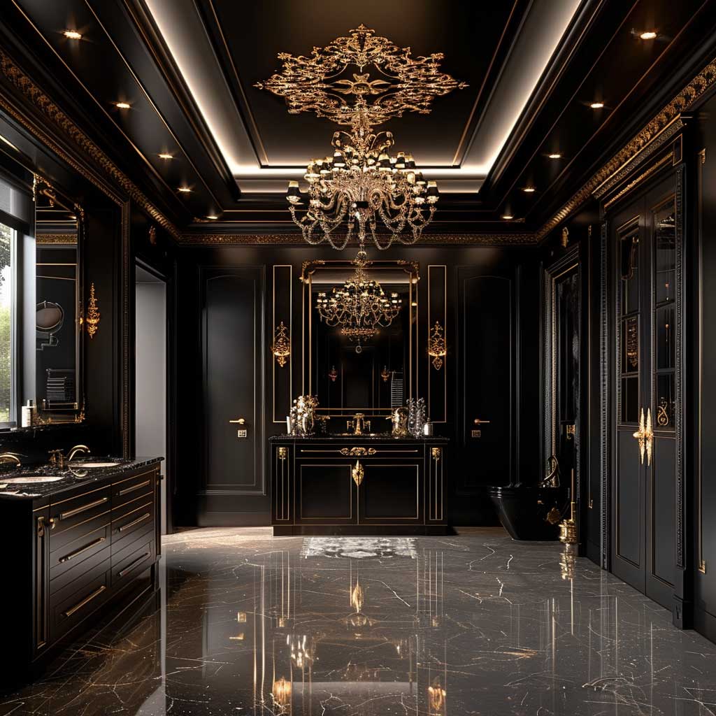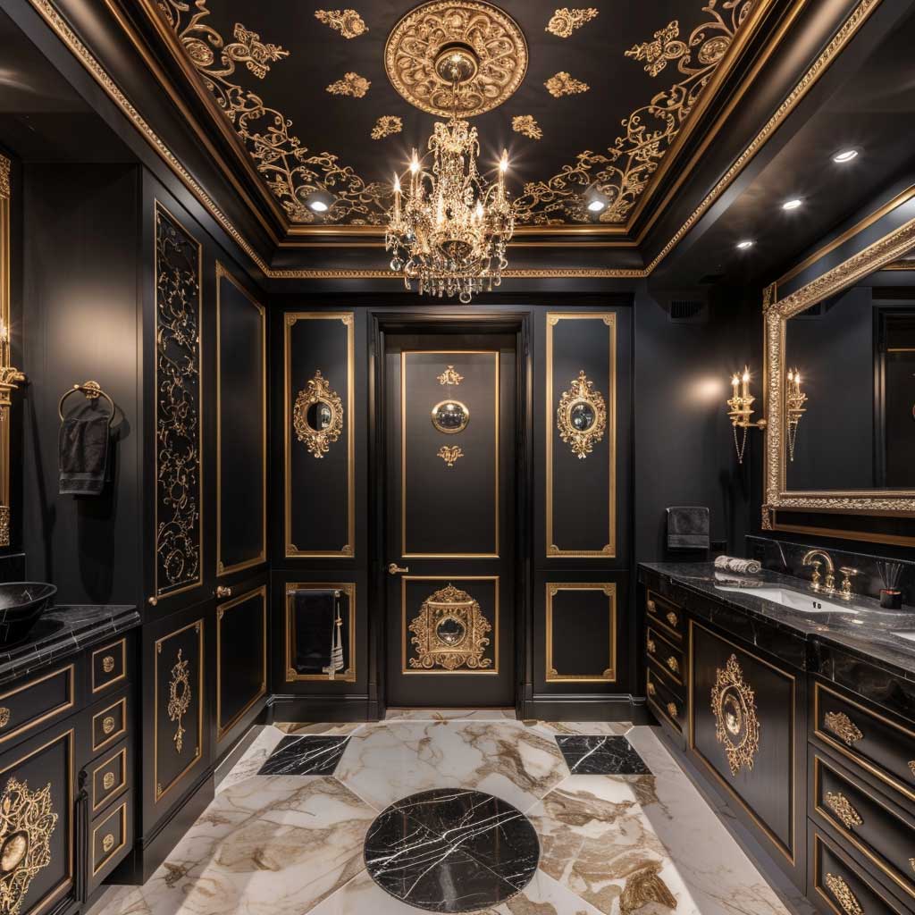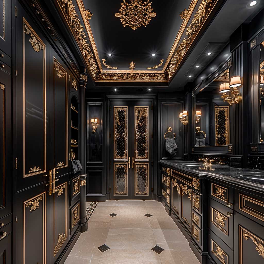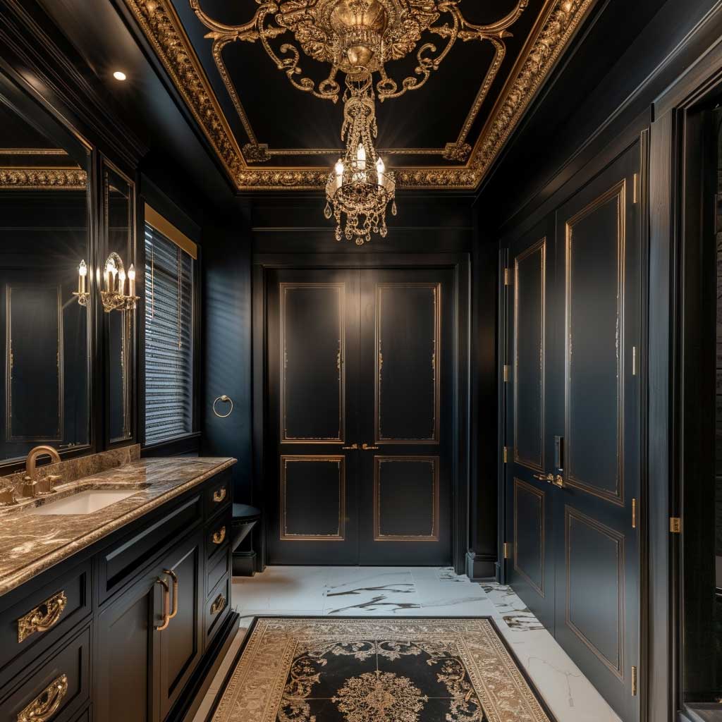 In this design, the walls are enveloped in a deep, lustrous black. This choice not only anchors the room but also amplifies the richness of any gold accents. Against this dark backdrop, gold takes on a luminous quality, its reflective surface catching light and drawing the eye. These gold details can manifest in various forms—be it through delicate filigree patterns that border the ceiling and door frames or through more substantial elements like a vanity adorned with gold leaf accents.
