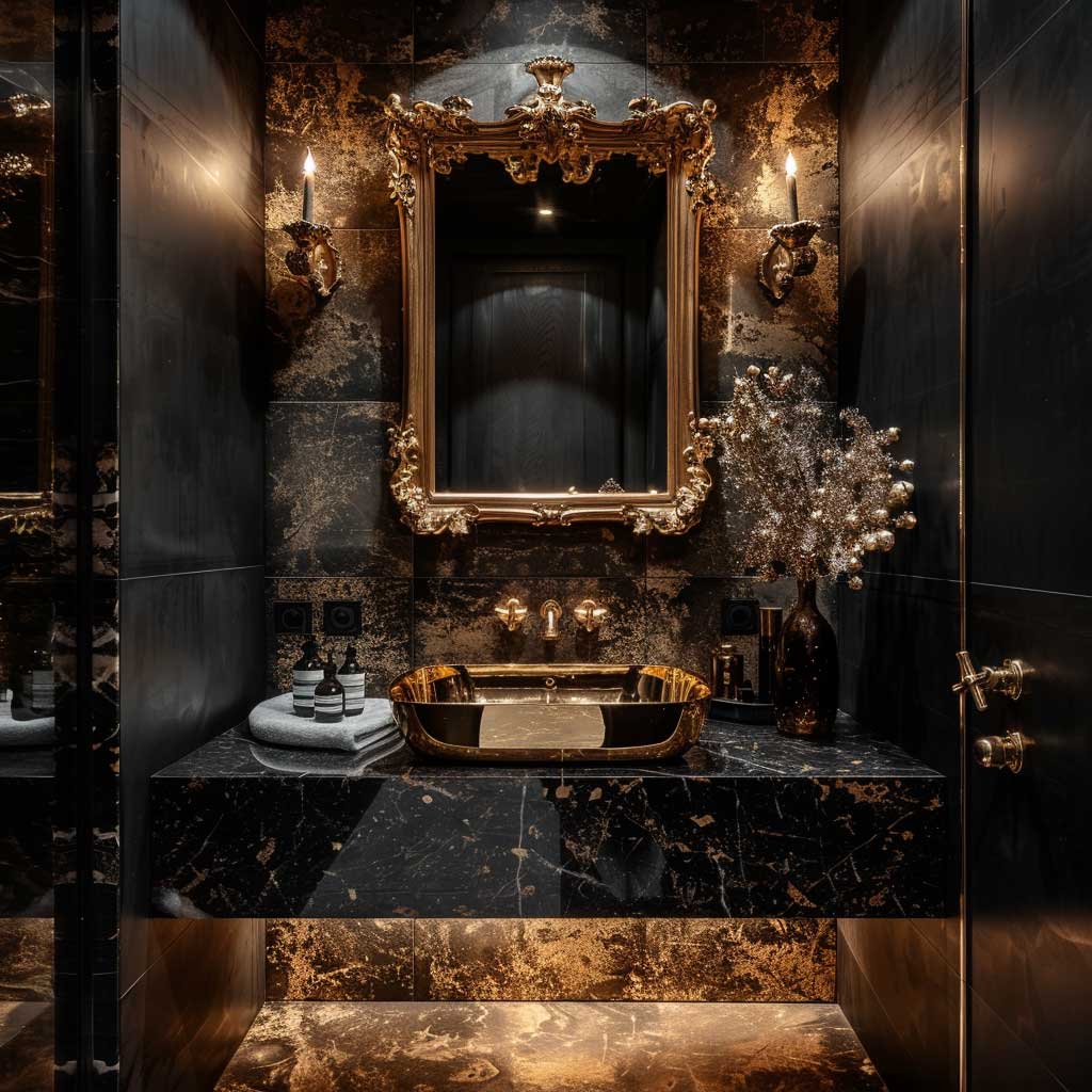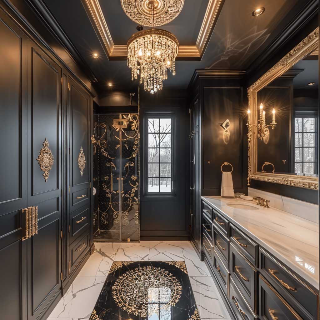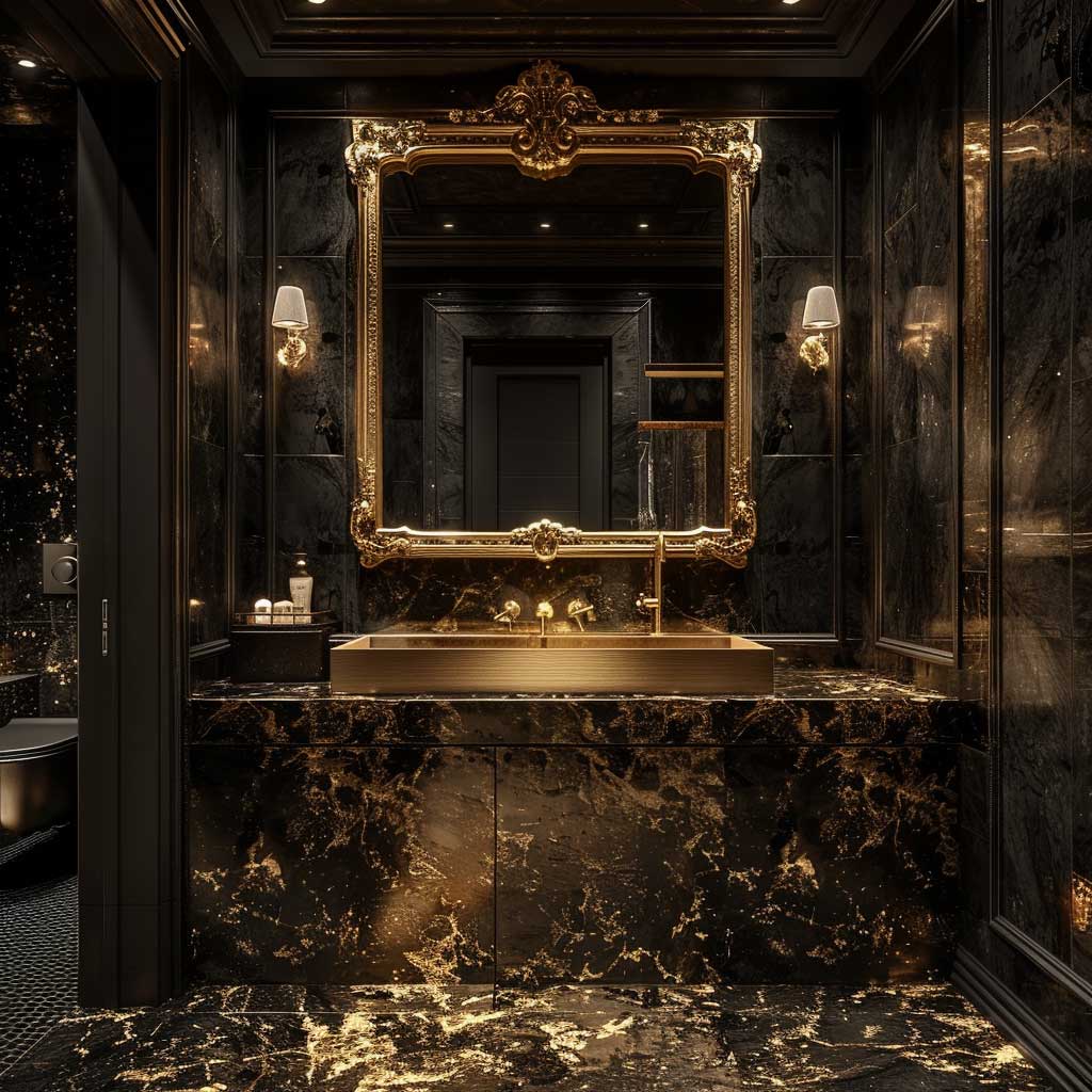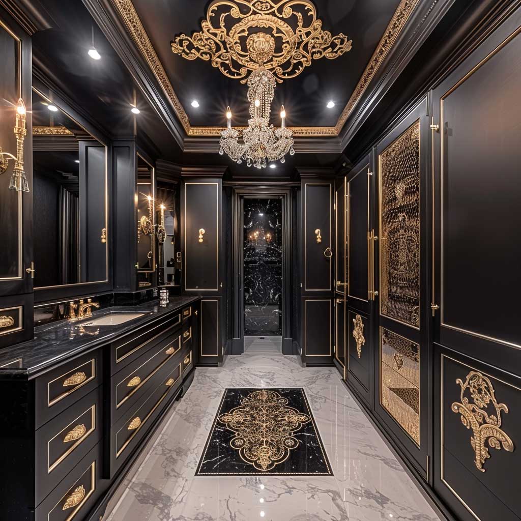 In this design, the walls are enveloped in a deep, lustrous black. This choice not only anchors the room but also amplifies the richness of any gold accents. Against this dark backdrop, gold takes on a luminous quality, its reflective surface catching light and drawing the eye. These gold details can manifest in various forms—be it through delicate filigree patterns that border the ceiling and door frames or through more substantial elements like a vanity adorned with gold leaf accents.
