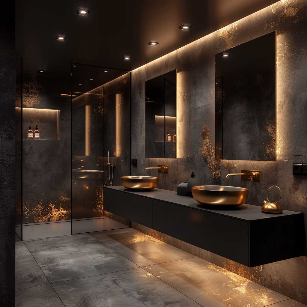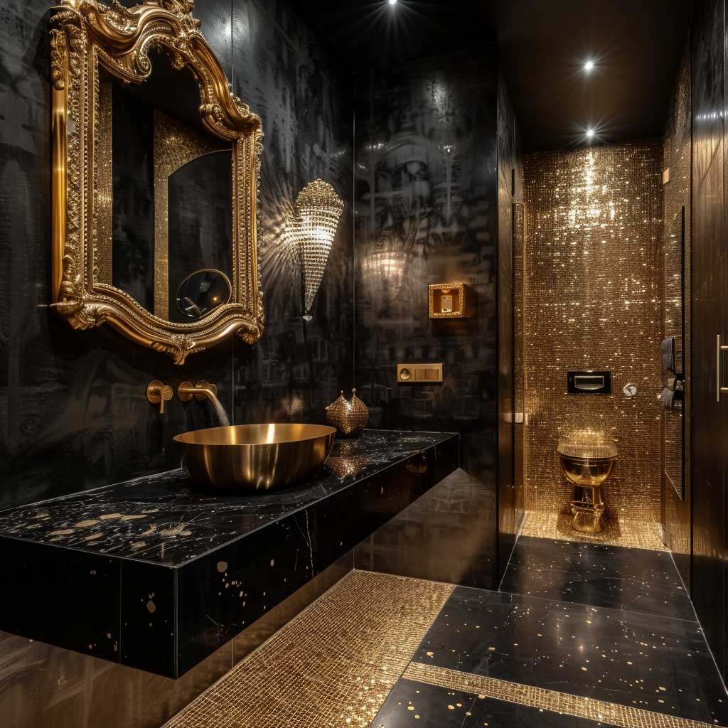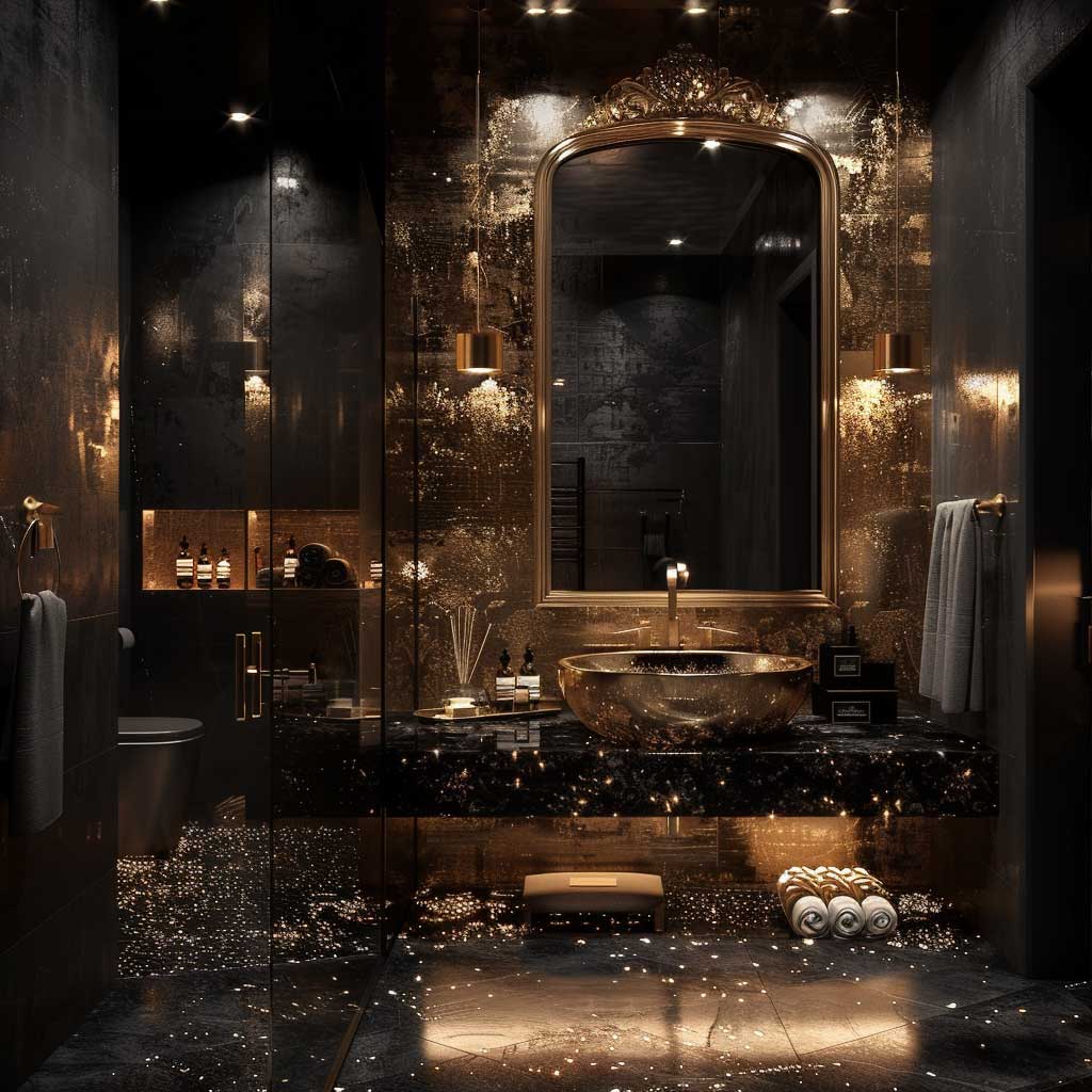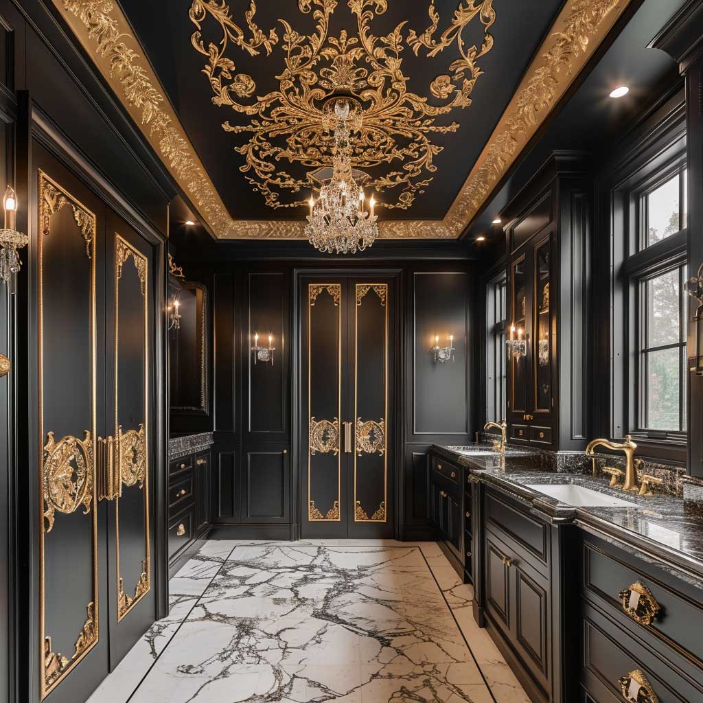 In this design, the walls are enveloped in a deep, lustrous black. This choice not only anchors the room but also amplifies the richness of any gold accents. Against this dark backdrop, gold takes on a luminous quality, its reflective surface catching light and drawing the eye. These gold details can manifest in various forms—be it through delicate filigree patterns that border the ceiling and door frames or through more substantial elements like a vanity adorned with gold leaf accents.