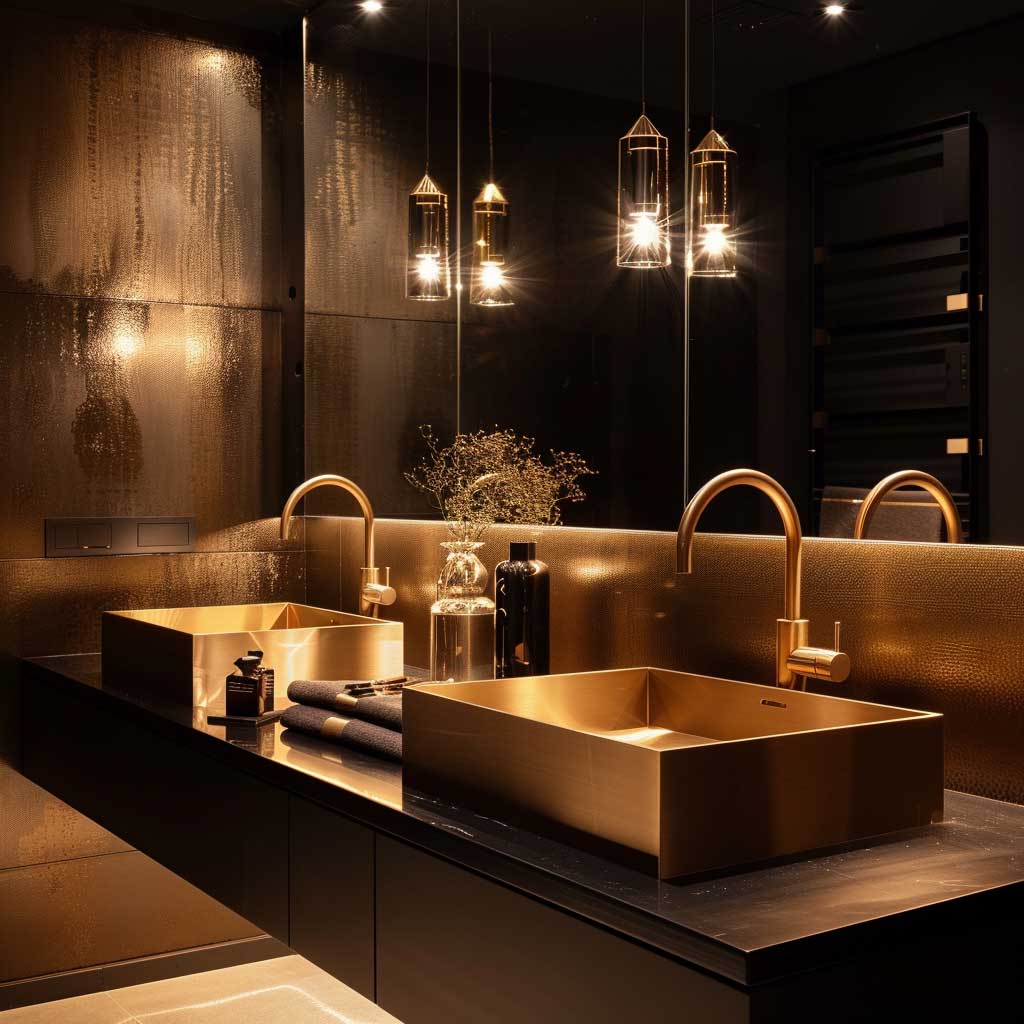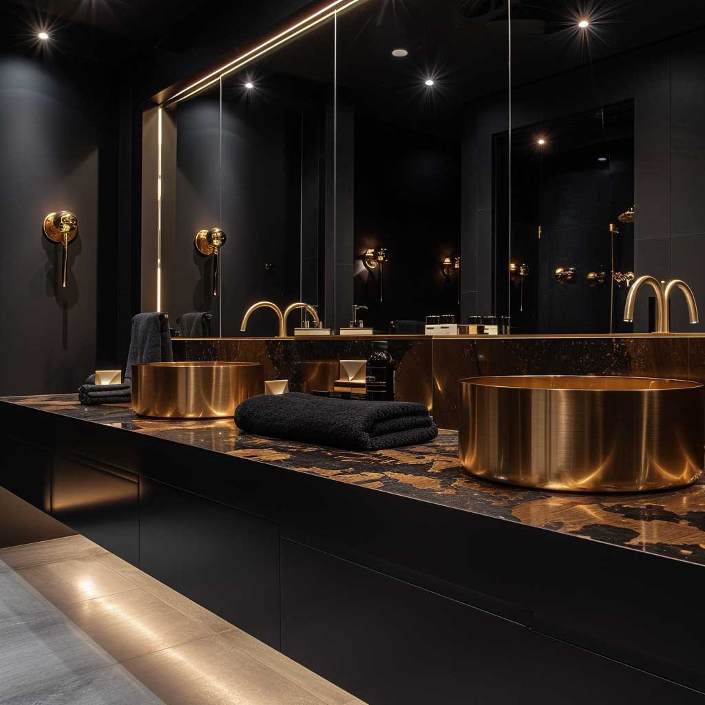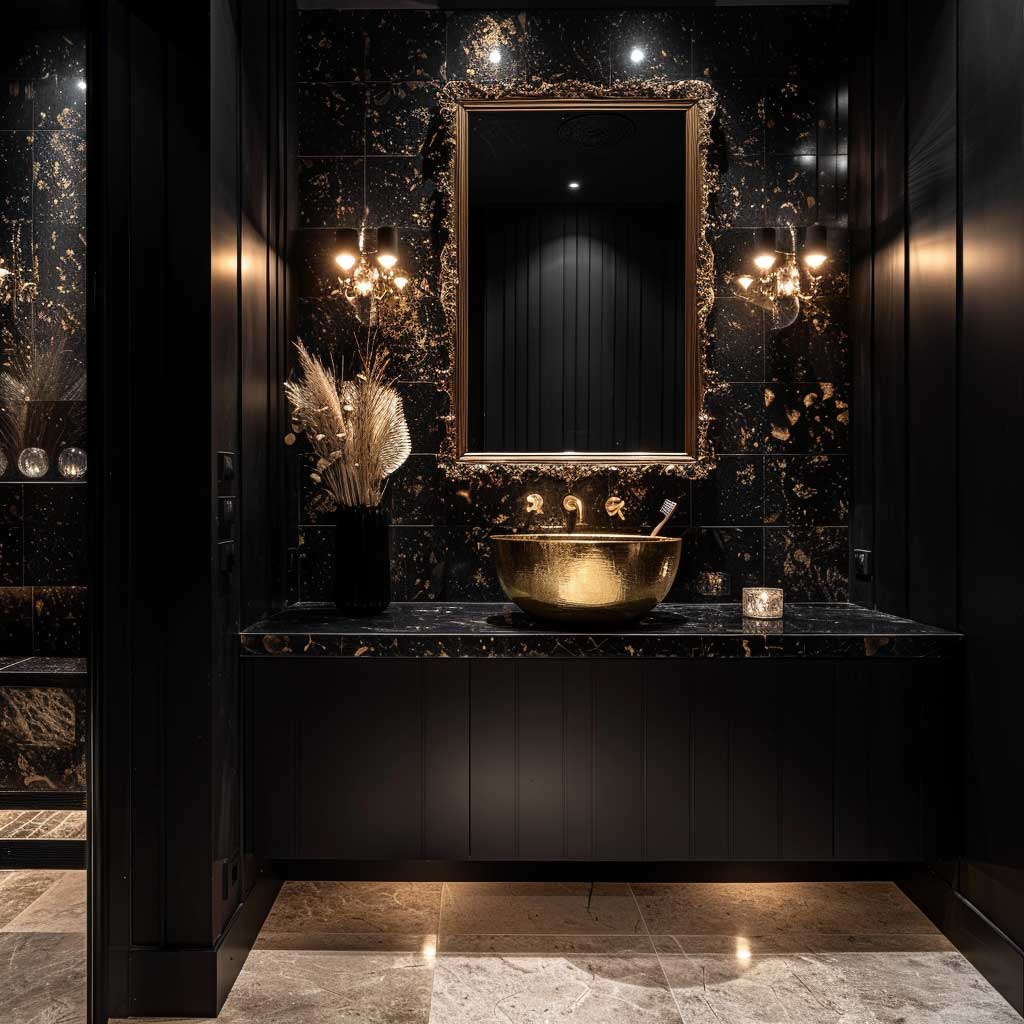 Starting with black walls as the foundation, the room instantly gains a dramatic and intimate atmosphere. This daring choice sets a stage where gold fixtures are not merely additions but are highlights that capture the essence of elegance. Gold, a symbol of luxury and finesse, when used for fixtures like taps, drawer pulls, and even light fittings, injects a vibrant burst of color against the dark walls. Each gold element acts like a star in the night sky, bright and arresting.