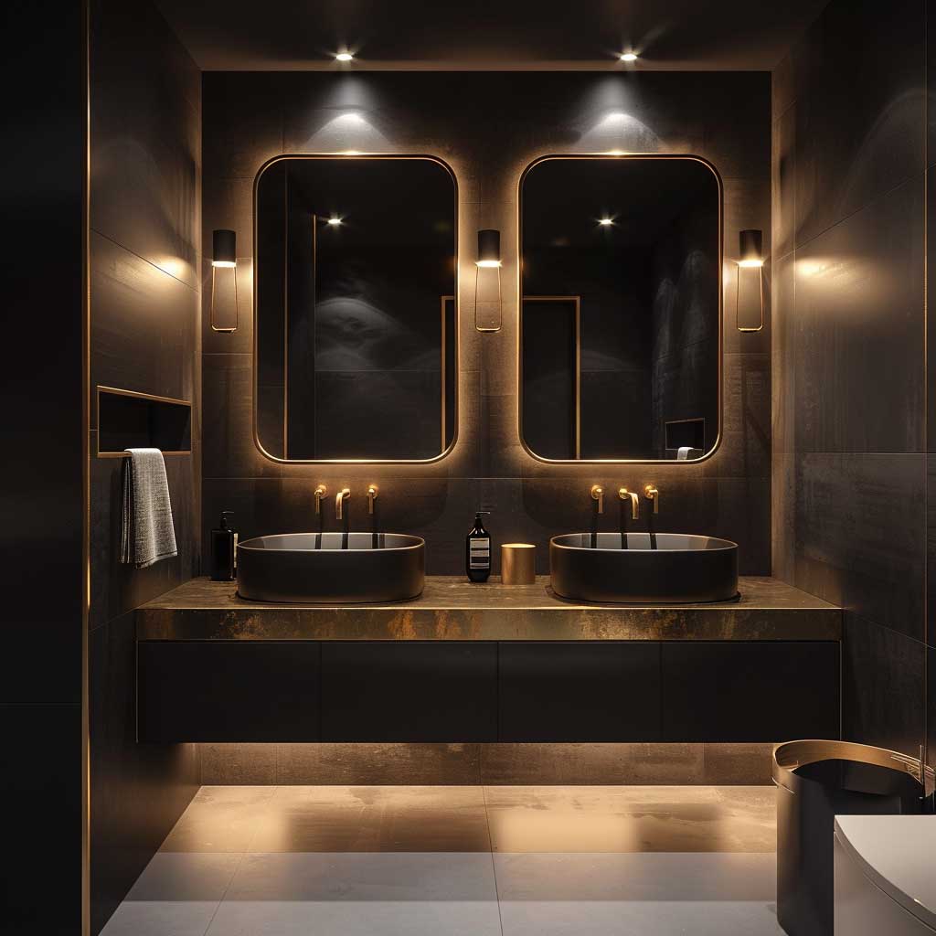 The flooring also plays a significant role in this design scheme. Opt for black marble or tiles with subtle gold flecks or patterns. This continuity in design ensures that the elegance is not just limited to the upper half of the room but flows throughout the space. Soft golden lighting can add warmth, softening the starkness of the black and creating a more inviting environment.