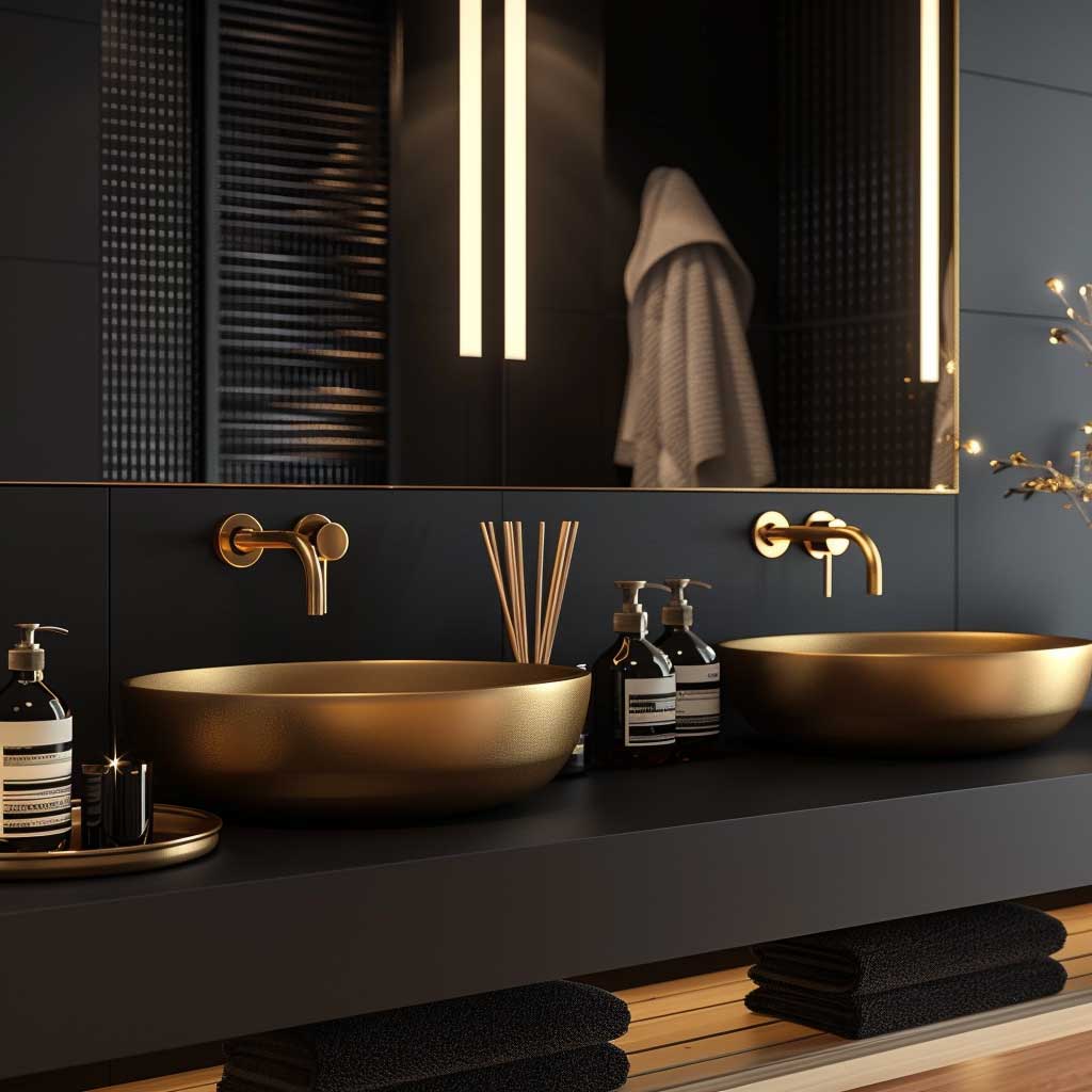 Elegant Contrast with Black Walls and Gold Fixtures in Bathroom Design