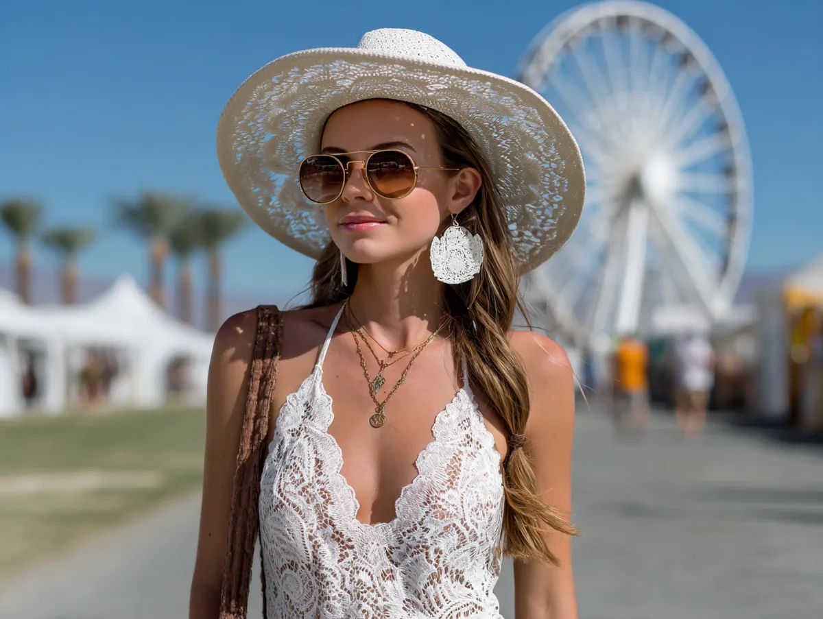 Lace rompers come in various cuts and colors, but opting for neutral tones like white, cream, or soft pastels enhances the boho-chic vibe. The intricate lace detailing creates a sense of delicacy, while the romper’s structure keeps the look effortless and easy to wear. Wide-brim hats are a festival essential, adding both flair and function, shielding you from the desert heat while completing your outfit with a fashionable touch.