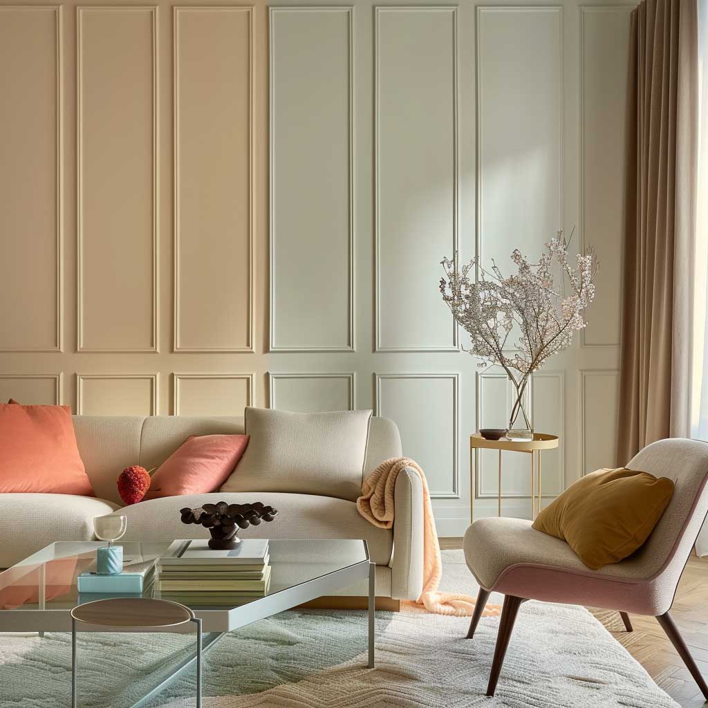 Incorporating color into living room panelling also means considering the interplay between light and shade, how colors interact with the furniture and decor, and how they change throughout the day. The right color choices can make a room feel larger, brighter, and more open, or cozy, intimate, and secluded, depending on the desired effect.