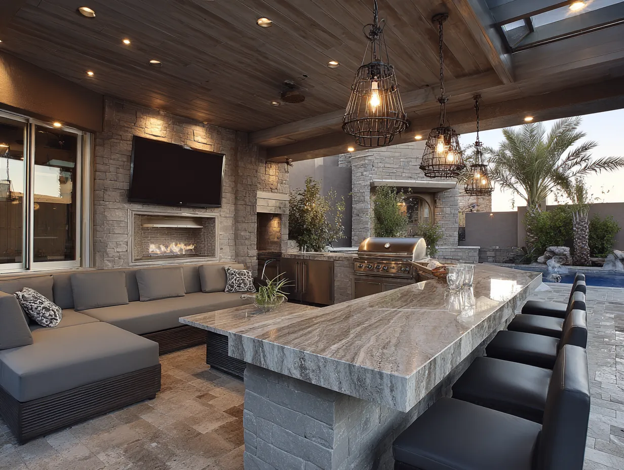 Storage and workspace are other critical elements. Modern outdoor kitchens incorporate ample cabinetry, often with custom solutions designed to protect utensils and cookware from the elements. These storage spaces are thoughtfully designed to ensure that everything a chef needs is within easy reach. Additionally, ample counter space allows for easy food preparation and can double as a serving area or bar, providing a multifunctional area that caters to both cooking and socializing.