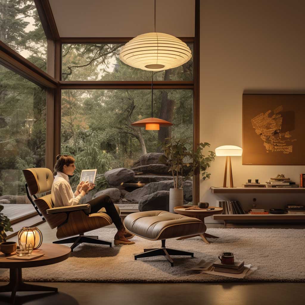 Artwork and decorative pieces in the room are carefully selected to complement the overall aesthetic. They are not just adornments but conversation starters, each with a story to tell. The room is a living museum of design history, showcasing iconic mid-century modern pieces alongside contemporary elements.