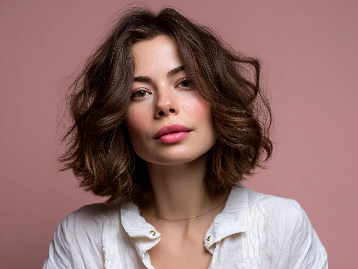 A shoulder length hairstyle for round chubby face with light waves suits countless occasions. It’s equally perfect for a creative work environment, an evening dinner, or a casual city stroll. Its charm comes from effortless proportion — the gentle swing of waves, the play of light, and the way it complements rounded contours without concealment. This hairstyle proves that symmetry can be found in softness, and true style is about embracing form rather than fighting it.