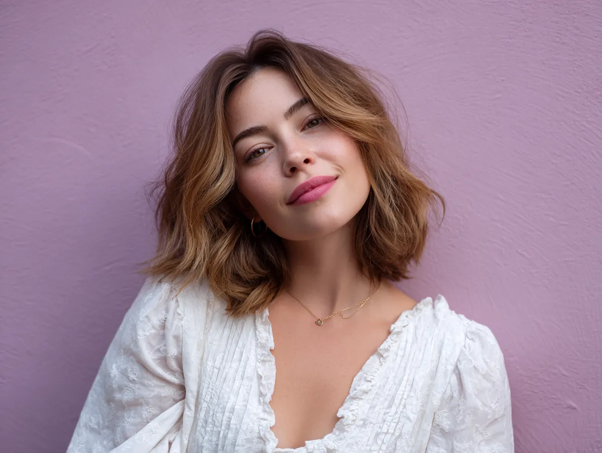 The shoulder length hairstyle for round chubby face with light waves brings balance by directing attention toward the jawline and neckline instead of the cheeks. Waves starting below the chin visually elongate the lower half of the face, producing a graceful downward movement. A slight off-center part or deep side part helps introduce asymmetry — one of the most effective illusions for creating a longer, leaner appearance.