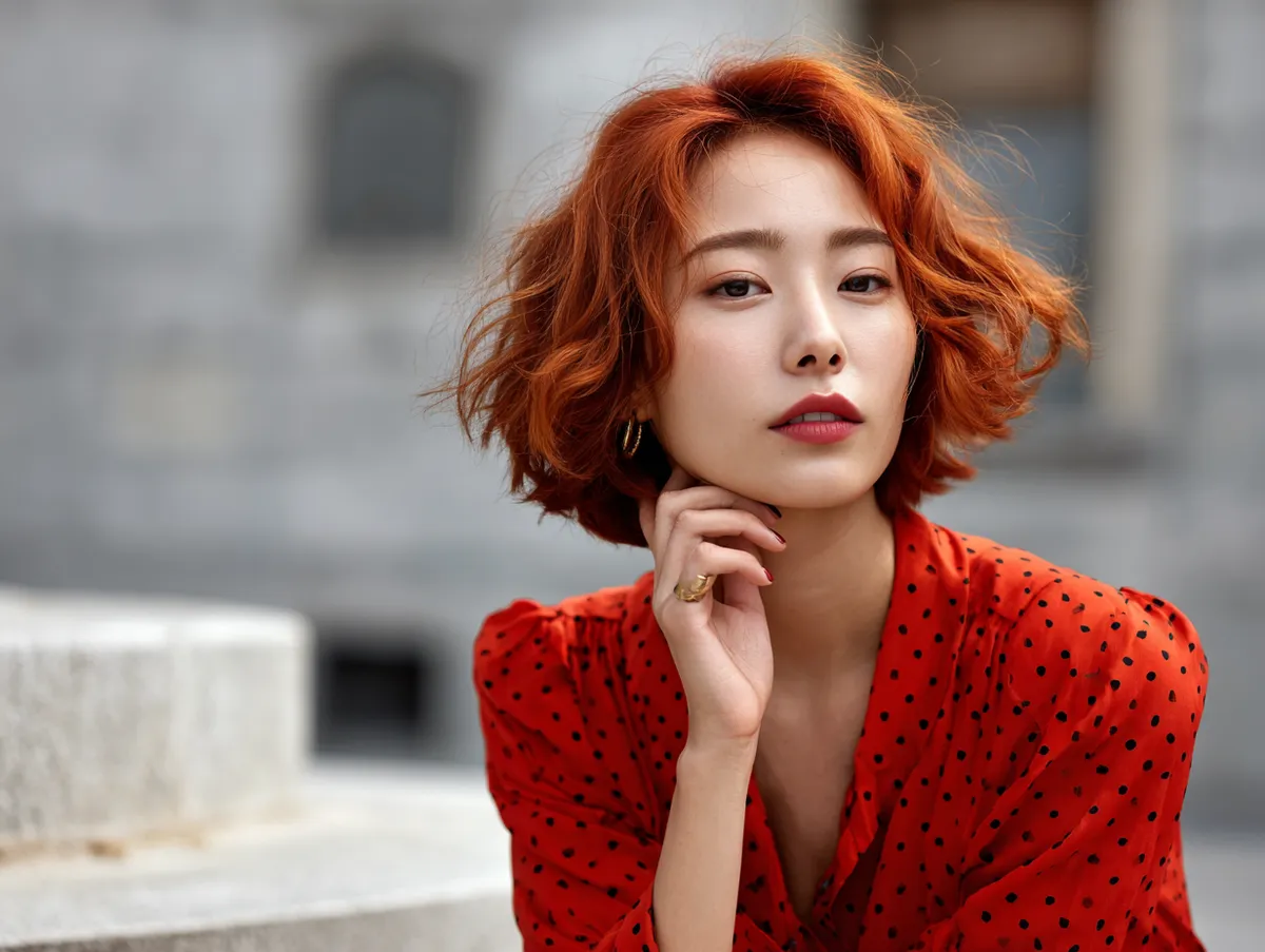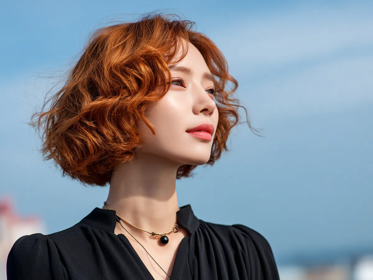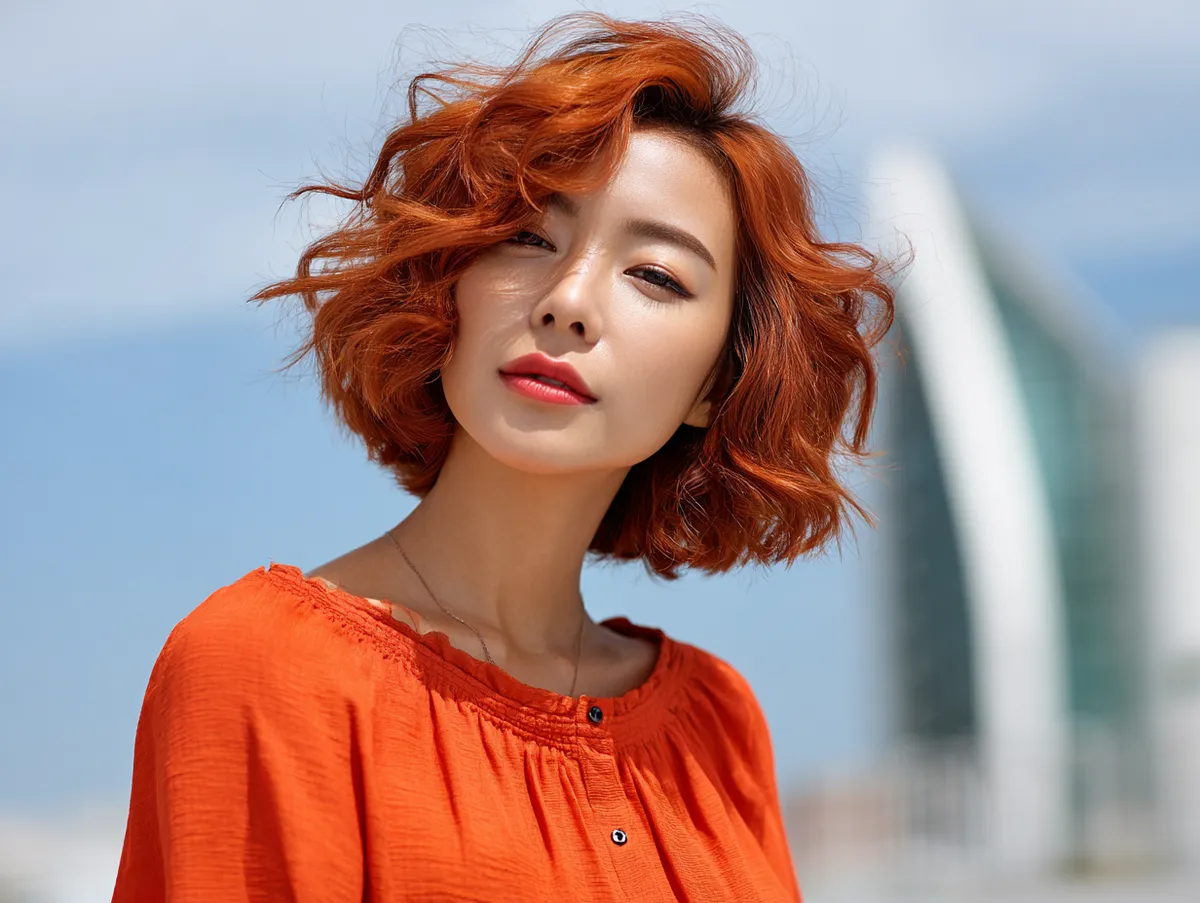 A wavy bob remains one of the most loved interpretations of a Korean short hairstyle. The waves create volume naturally, while the bob cut ensures the style stays light and flattering. Adding fiery red shine elevates the look into something bold and striking. It draws attention to the natural movement of waves while highlighting every curve and strand.