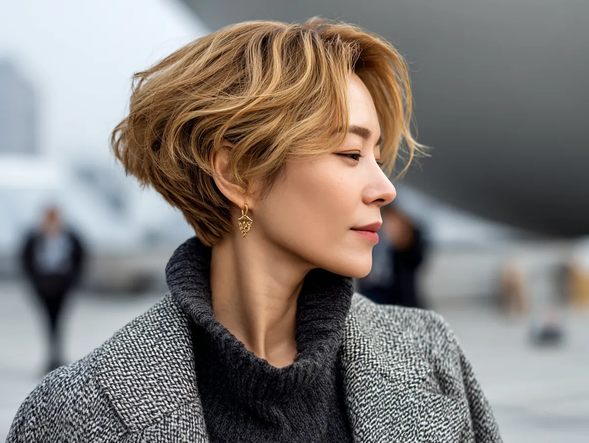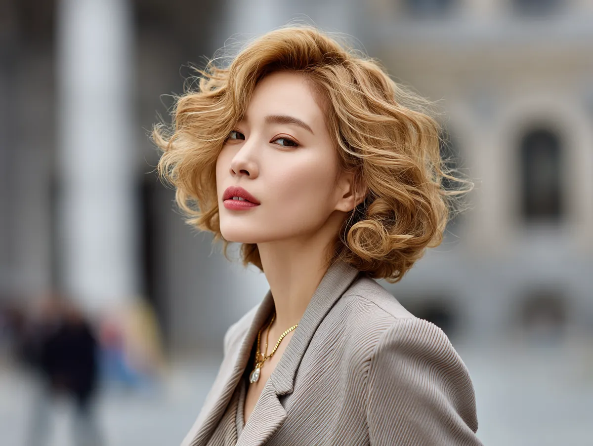 What makes this look stand out is its adaptability to different moods. Tousled waves create a relaxed, beachy vibe, while neatly styled layers offer elegance. The golden blonde glow provides a playful yet sophisticated twist, allowing the wearer to embody both confidence and softness. A Korean short hairstyle like this celebrates wavy textures while adding the perfect amount of modern sparkle.