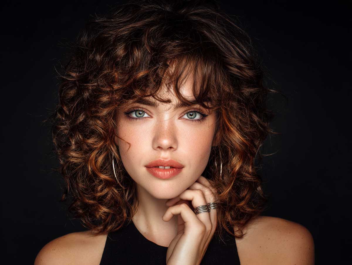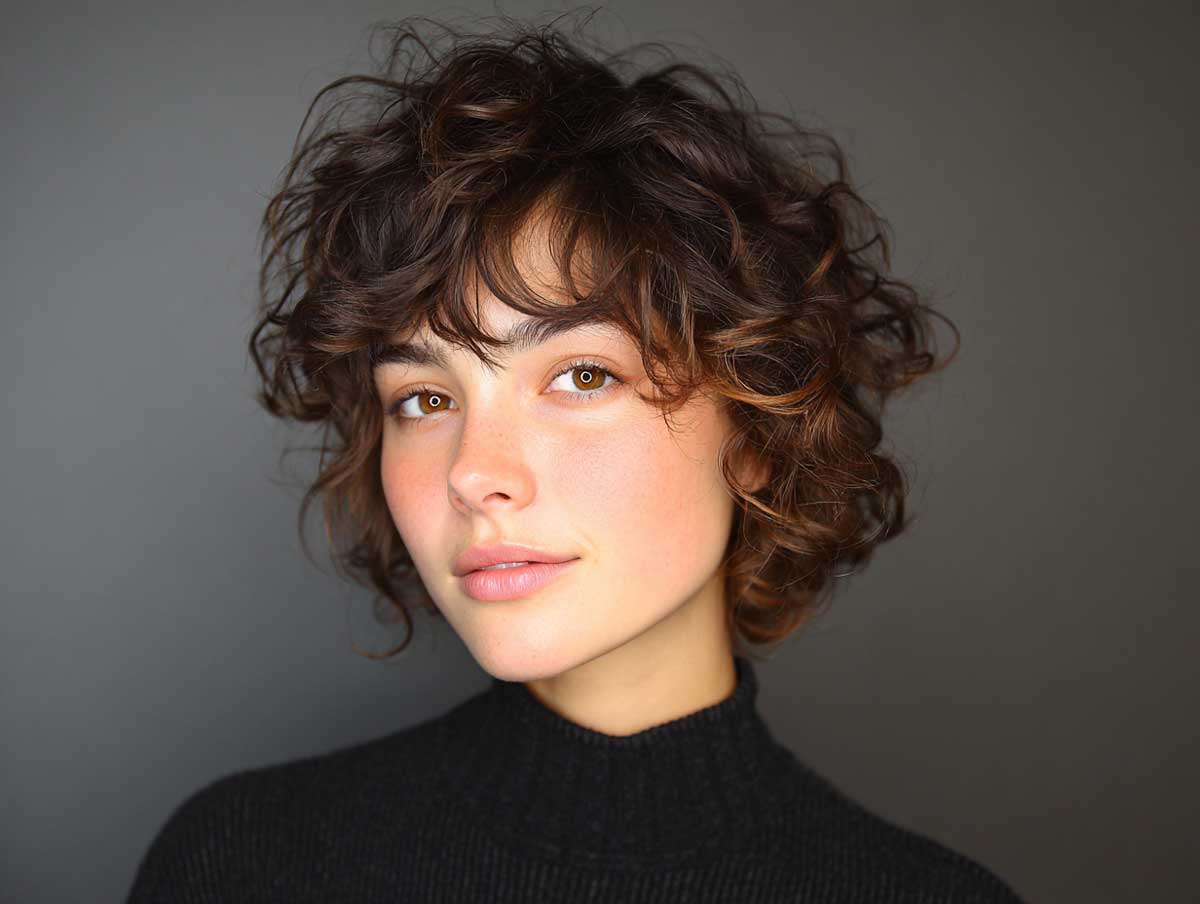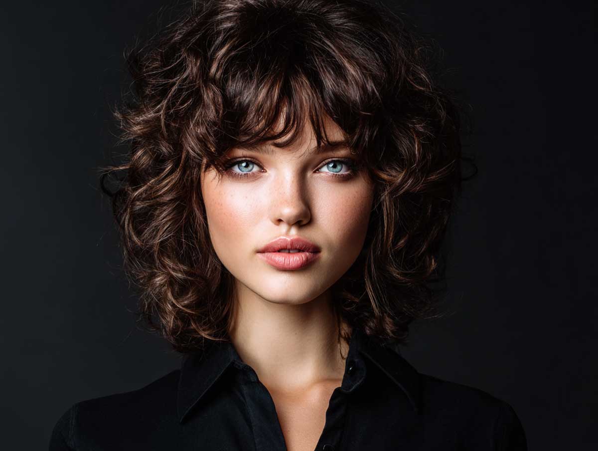 One of the most effective ways to visually elongate a round face is by adding height at the crown. This variation of the curly shag haircut emphasizes upward movement while incorporating an angled fringe that slims the face from the top down. The contrast between the elevated crown and diagonal bang draws attention upward and creates the illusion of a more oval silhouette.