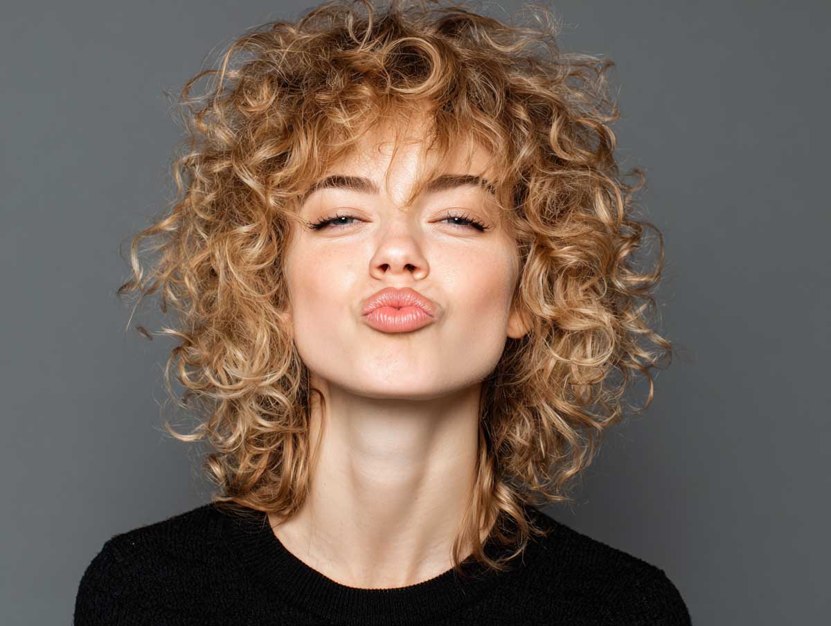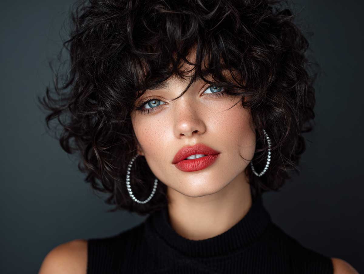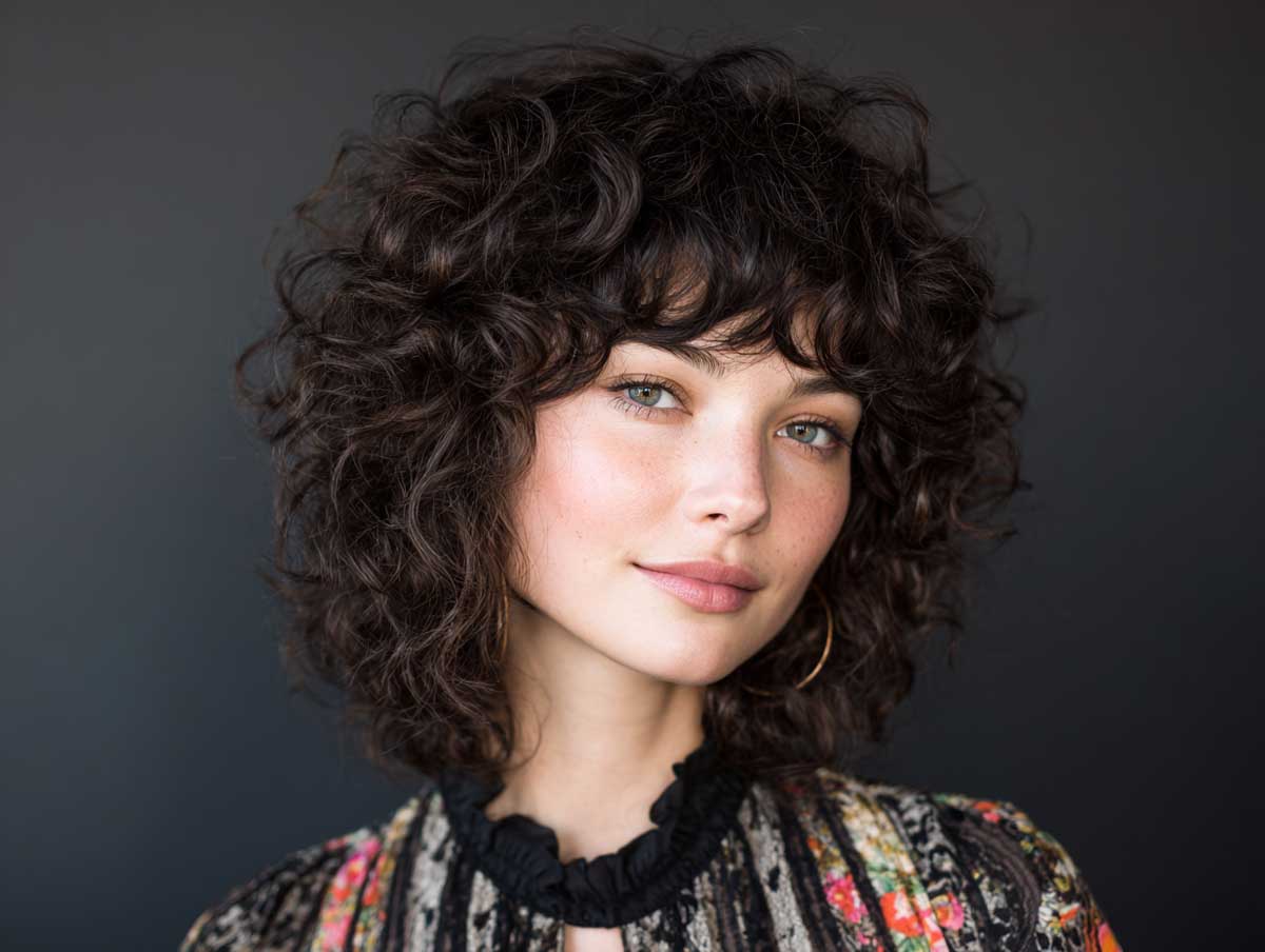 One of the most effective ways to visually elongate a round face is by adding height at the crown. This variation of the curly shag haircut emphasizes upward movement while incorporating an angled fringe that slims the face from the top down. The contrast between the elevated crown and diagonal bang draws attention upward and creates the illusion of a more oval silhouette.