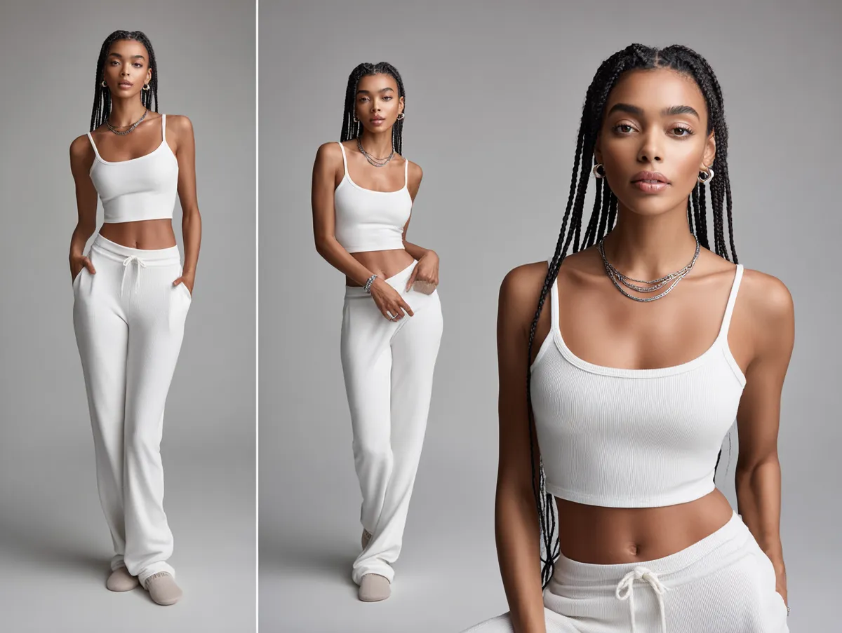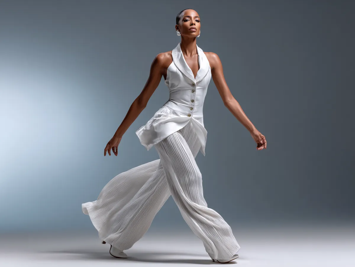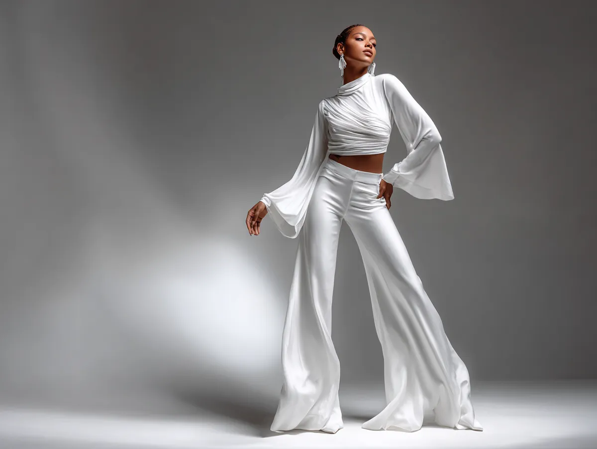 Accessories play a strategic role, too. Delicate jewelry keeps proportions refined, while minimalistic clutch bags add utility without overpowering. Choosing pointed shoes or sandals with ankle straps further emphasizes length, particularly when kept in the same white palette.