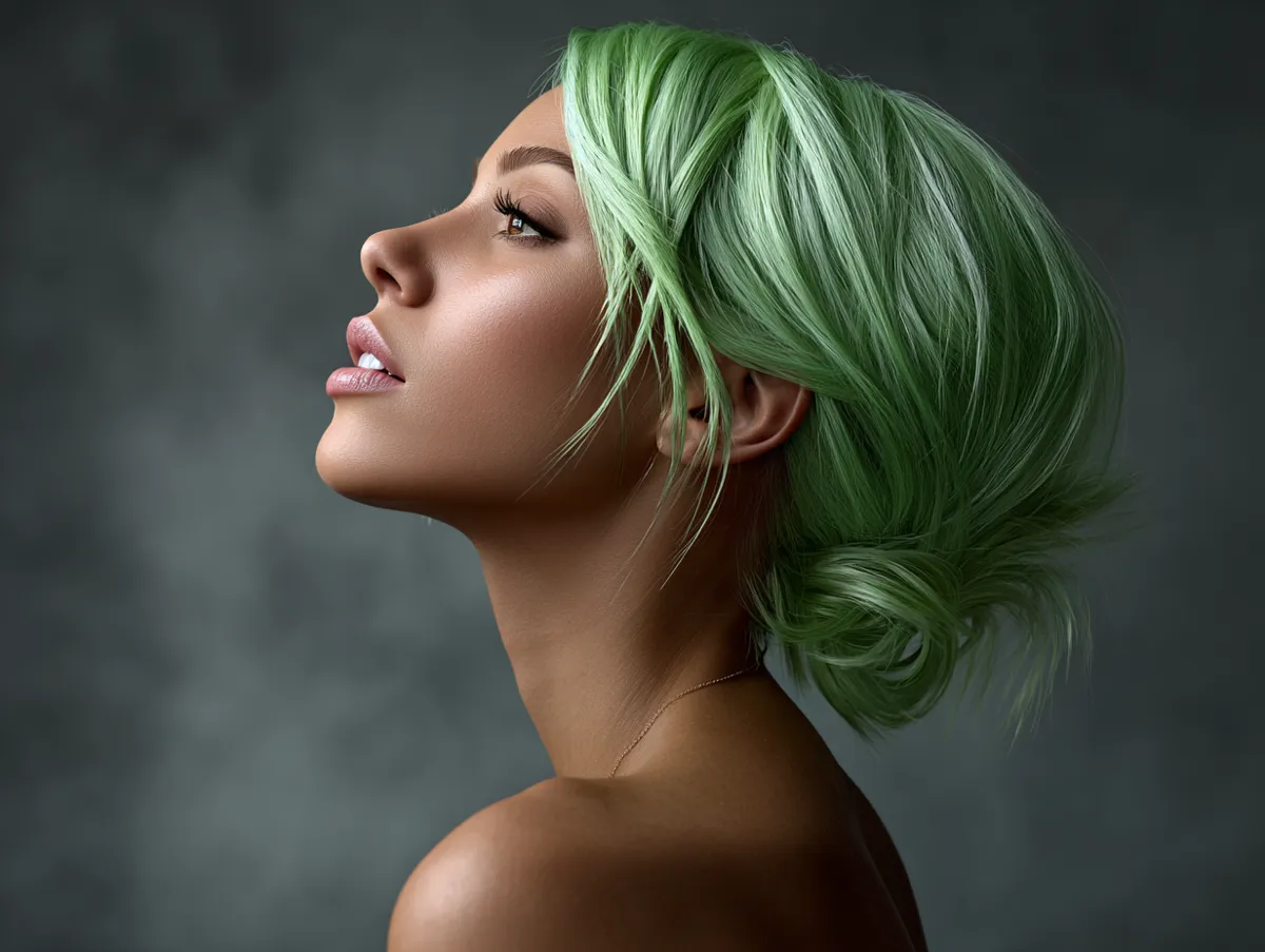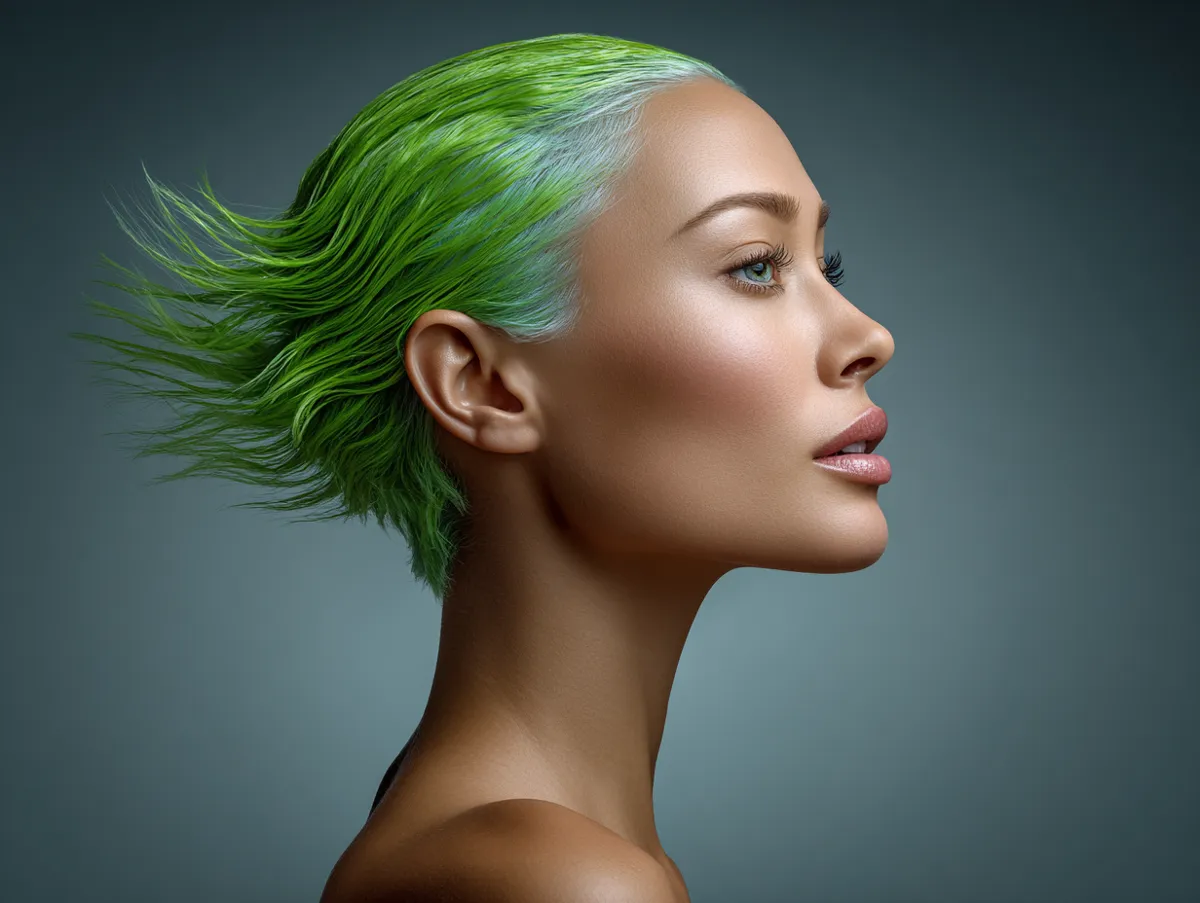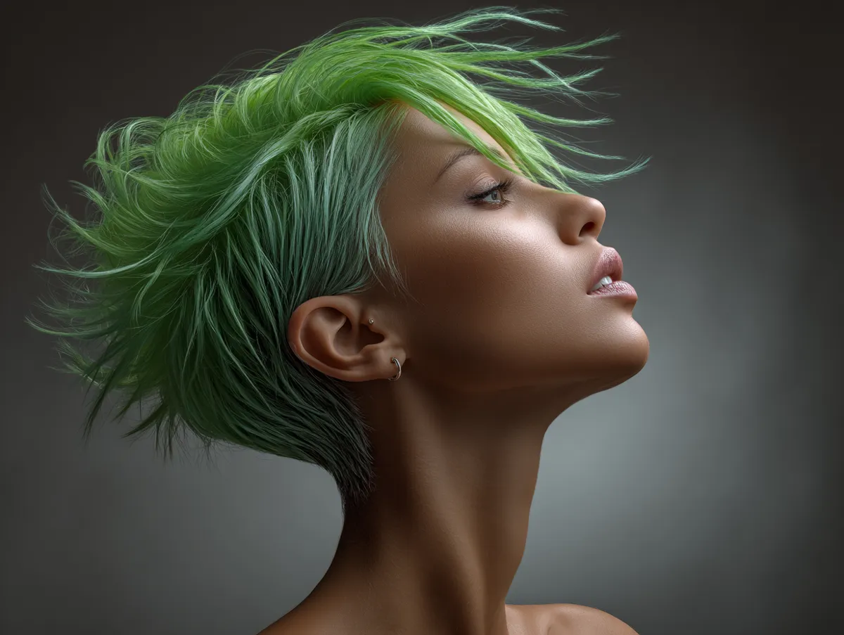 Color increases the effect. Neon green, although bold, works brilliantly in fashion photography and street-style moments. Bright pigment makes each strand more visible, so even a feathered line looks thicker and richer. When light hits the neon surface, the edges glow, creating a dramatic contrast between hair and skin. The neck, being a softer tone, appears longer because the bright shade creates a frame. Even ponytails or half-up styling will show the lifted architecture.