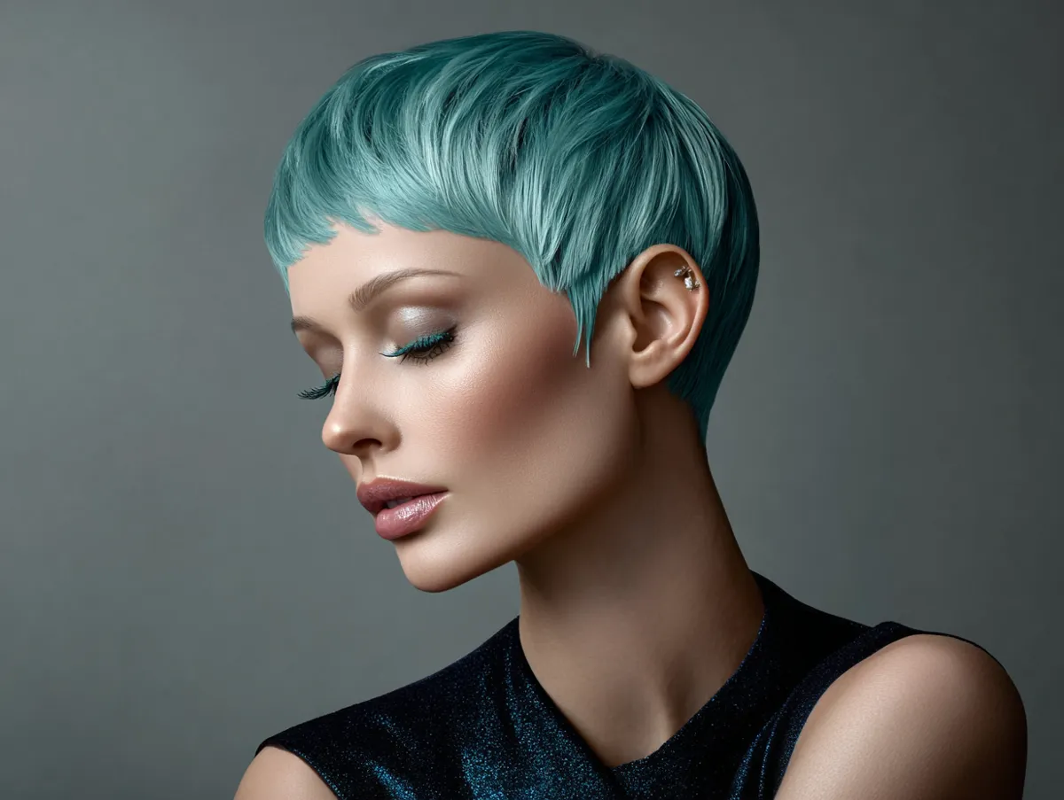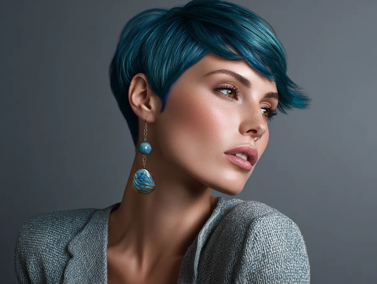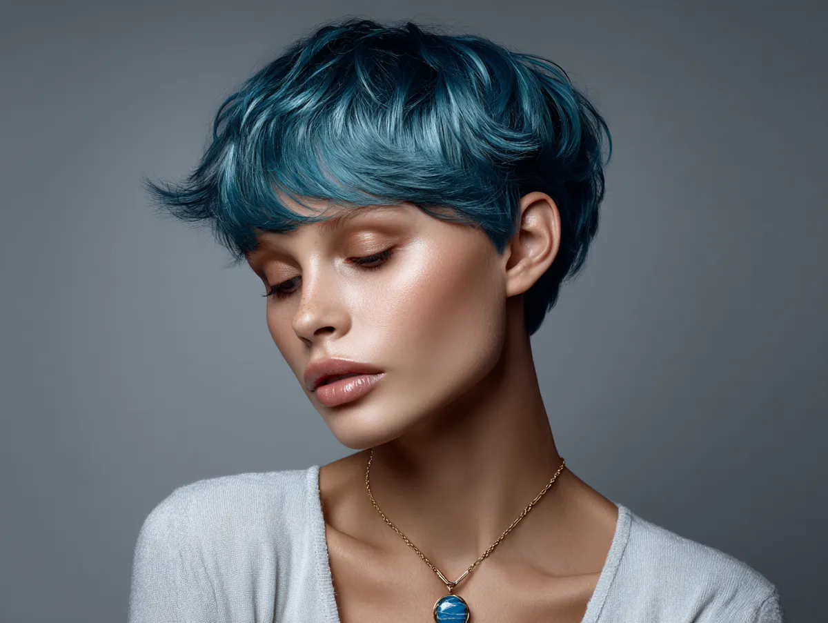 Color adds personality. Sapphire teal gives a jewel-like glow that instantly enhances density. Deep pigments make strand edges more noticeable, and thin hair benefits from this contrast. Under natural light or in nightlife settings, sapphire tones capture and reflect illumination. Women who want something artistic without losing sophistication often gravitate to rich gemstone shades. With contour cropping, bold color does not overwhelm — the shape is short, elegant and confident.