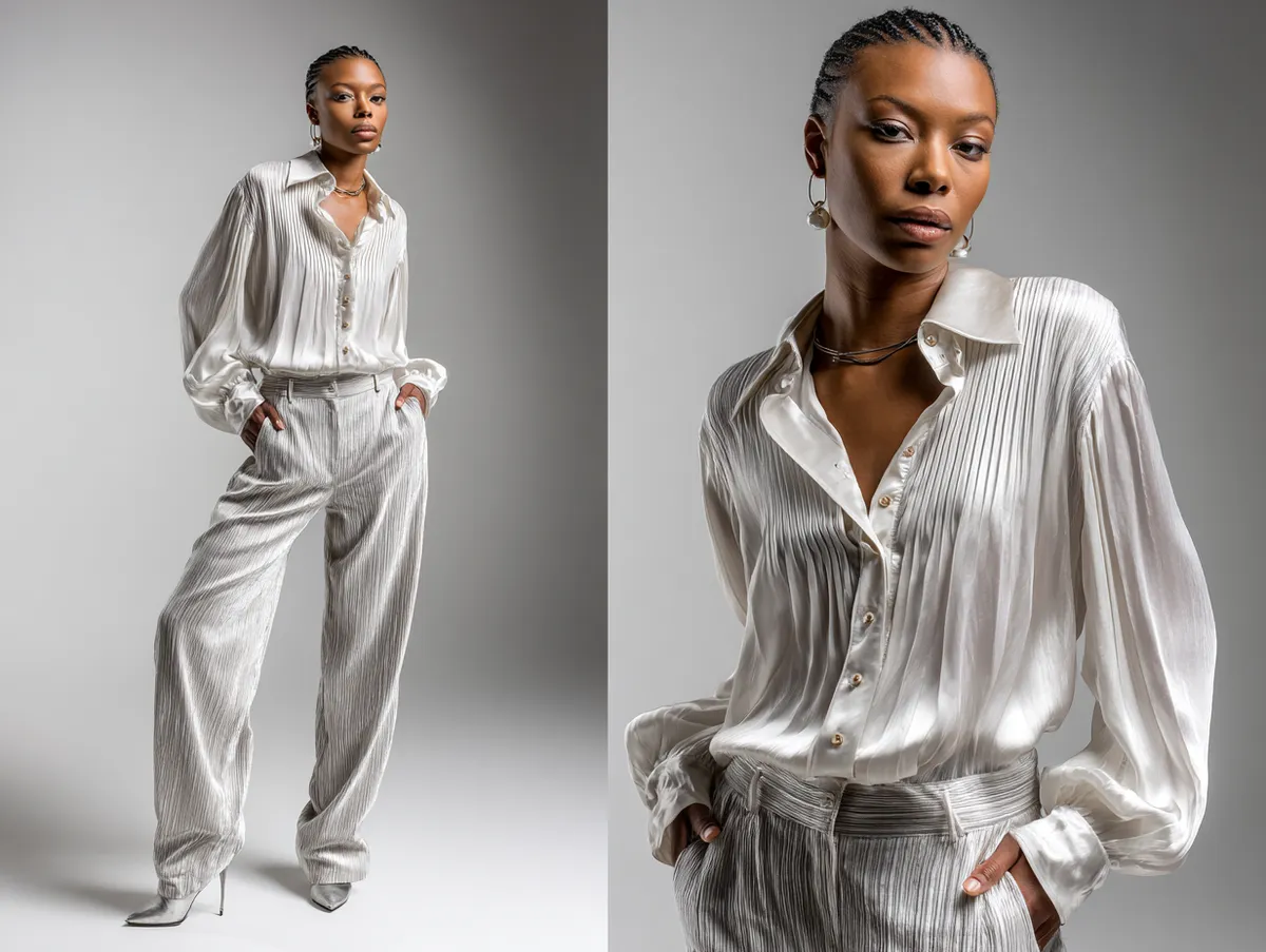 The appeal of trouser outfit ideas using silk shirts lies in versatility. A crisp white silk shirt with dark trousers creates a minimalist foundation perfect for office meetings or formal occasions. On the other hand, jewel-toned silks like emerald, sapphire, or ruby transform the pairing into a bold expression of personality. Even printed silk shirts featuring florals, polka dots, or abstract shapes elevate the look without overwhelming it, thanks to the simple structure of slim trousers.