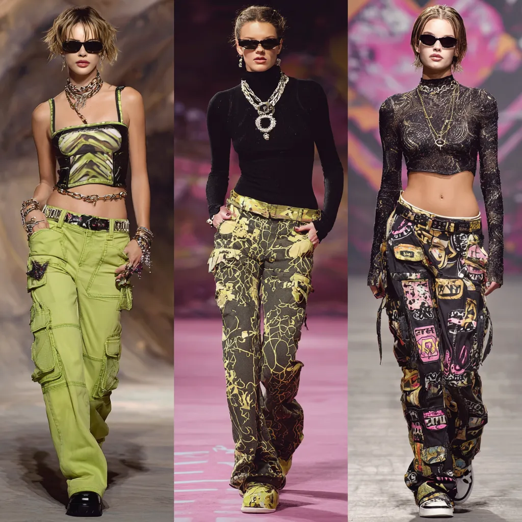 The first major element is the heavy influence of what is often called Cybercore or futuristic fashion. At the turn of the millennium, there was a widespread fascination with technology, the internet, and the future. This translated into noughties fashion through the extensive use of metallic fabrics, shiny pleather, iridescent materials, and utilitarian details. Today, we see this manifesting in silver trousers, reflective puffer jackets, and hardware-heavy accessories. Clothing featuring buckles, excessive zippers, and reflective piping taps directly into this matrix-inspired vision of the future. It provides an edgy, industrial contrast to the softer, more feminine trends of the same era, proving the incredible duality of the overarching style.